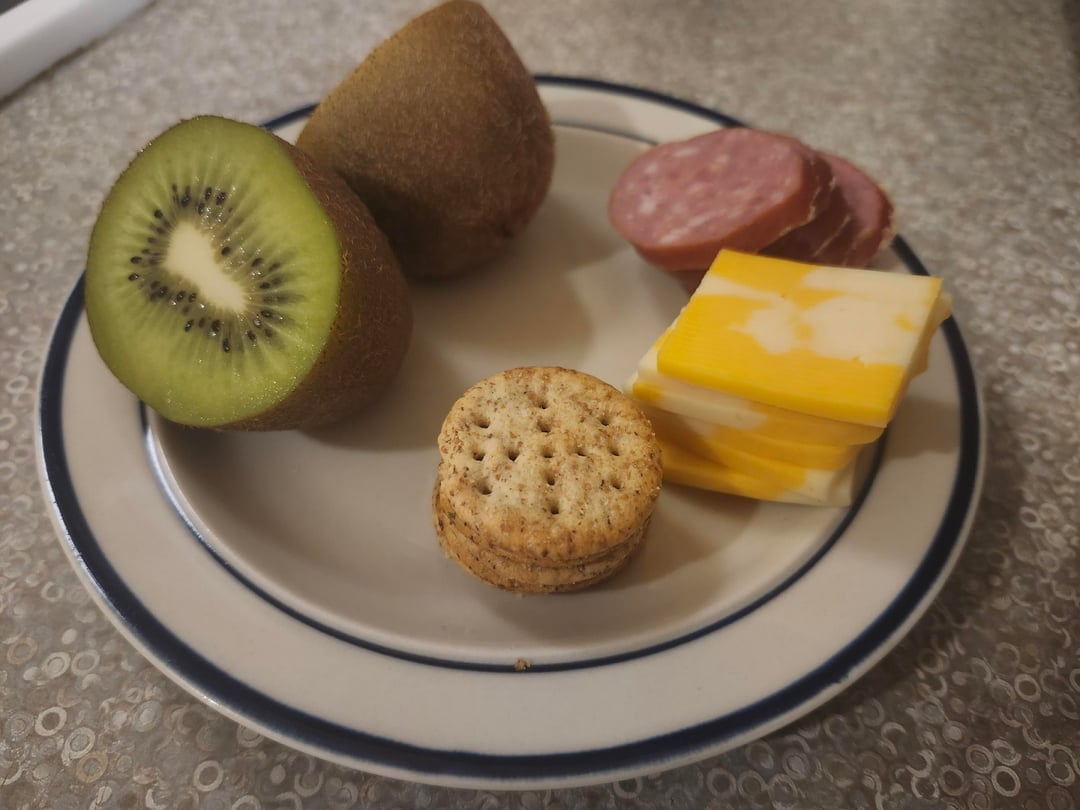 Tea time is my tieover between my tiny lunch and my dinner, almost a sort of lunch pt2 for me. It's a green-black blend with a just a little bit of honey. With it, I have some cheese, sausage and crackers and a piece of fruit.
