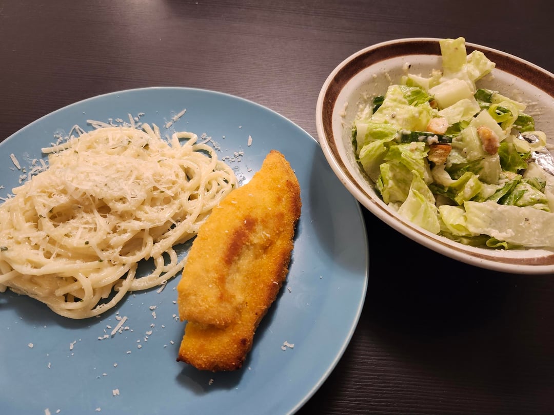 Dinner here is a half of a cheese and broccoli stuffed chicken breast with a small portion of creamy garlic spaghetti with fresh grated parmigiano reggiano cheese and a caesar salad with cucumber to make up for the limited amount of lettuce I had. Many of the things here