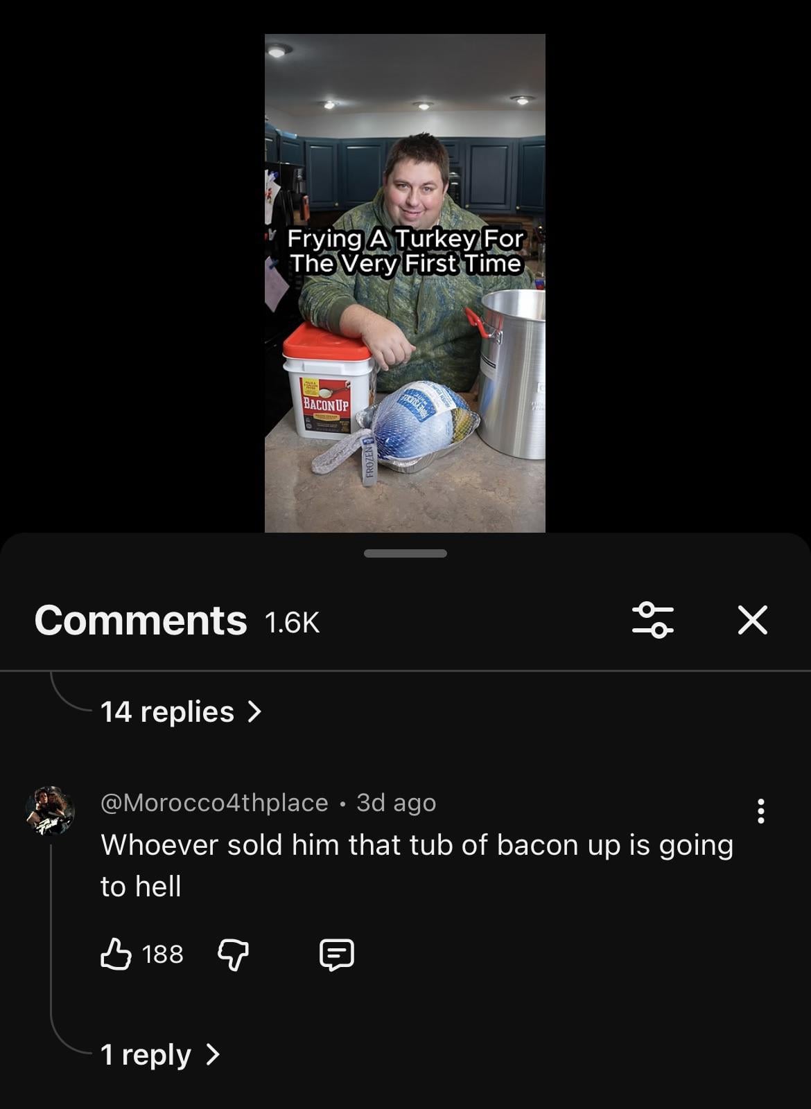 Genuinely one of the funniest comments I’ve ever read by buttergub 11 Comments Conscious_Trade_2549 4 months ago That’s fucked up, but still really funny. Dude needs to prioritize his health UncleBubax 4 months ago Sounds like you need to read more comments. Lochness_Hamster_350 4 months ago He’s a big dude but he’s feeding a family of 6 I believe. Themountaintoadsage 4 months ago Sorry what’s bacon up? parkrat92 4 months ago Ya I mean it definitely is a comment, I’ll give you that. North81Girl 4 months ago That’s the smallest turkey I’ve ever seen asdasdasdasda123 4 months ago Heart disease speed run Cool-Presence-6703 4 months ago What does this have to do with grilling? Dependent_Code7796 4 months ago I don’t get it. Is it cuz he’s fat and the bacon fat is gonna make him fatter somehow? Or is it because that shit is so overpriced? SUPRDLUX 4 months ago 60 bucks. that’s how much it costs to burn your whole house down and get you hungry at the same time allmykitlets 4 months ago TIL I have no sense of humor.
