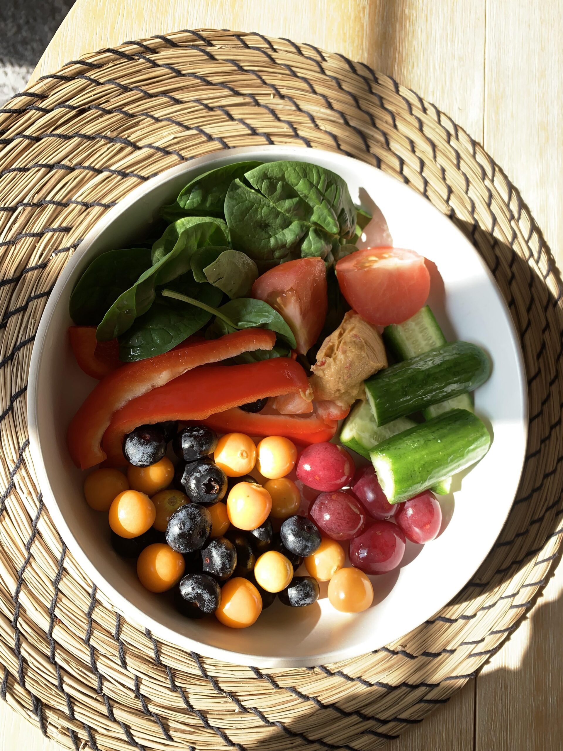 Cucumber, gold berry, blueberry, grapes, red pepper, spinach, pepper humus, and tomato.