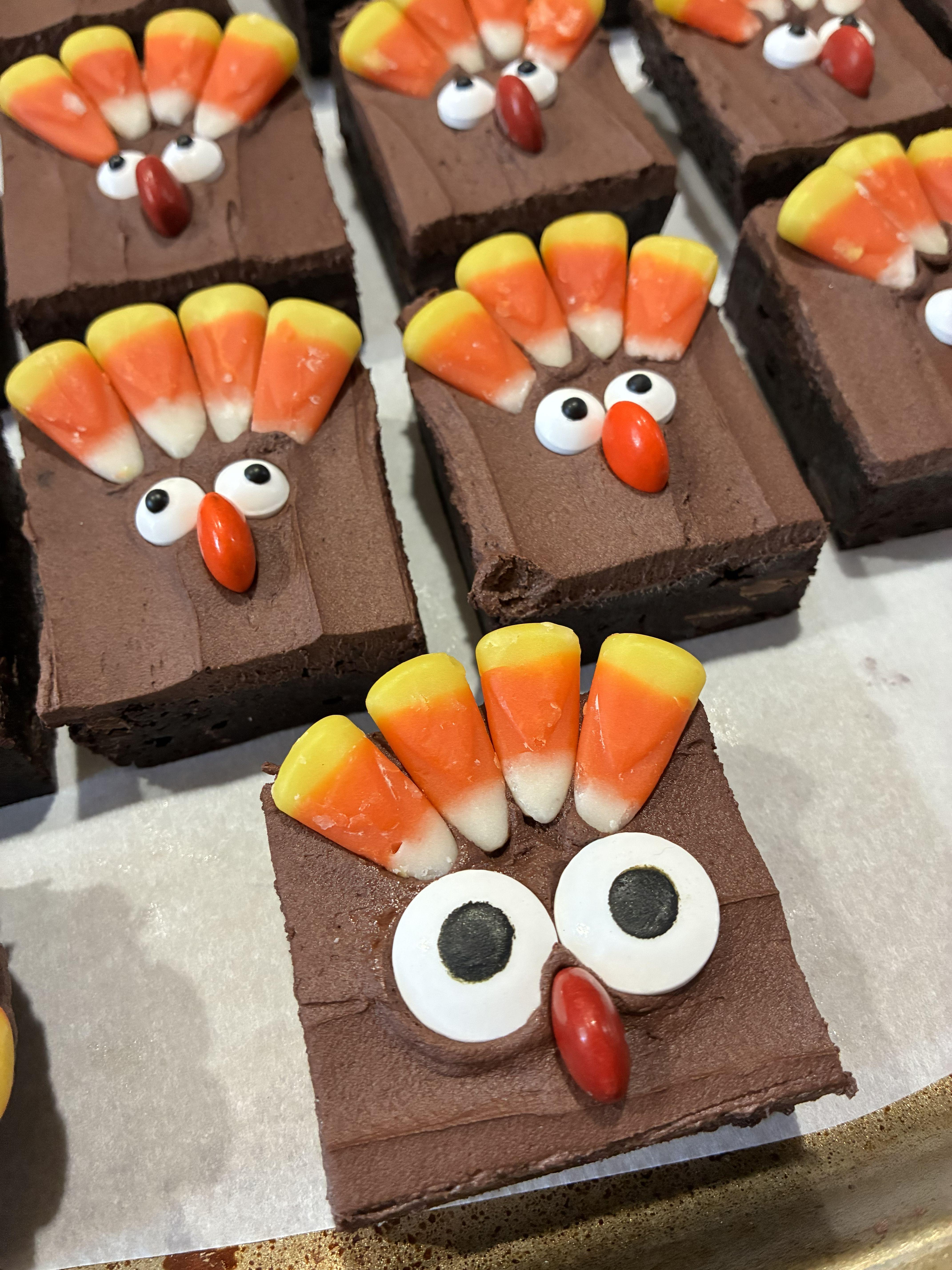 After pushing out thanksgiving items all day today for tomorrow pick up, I relate more to the big-eyed, mildly panicked looking turkey brownie.