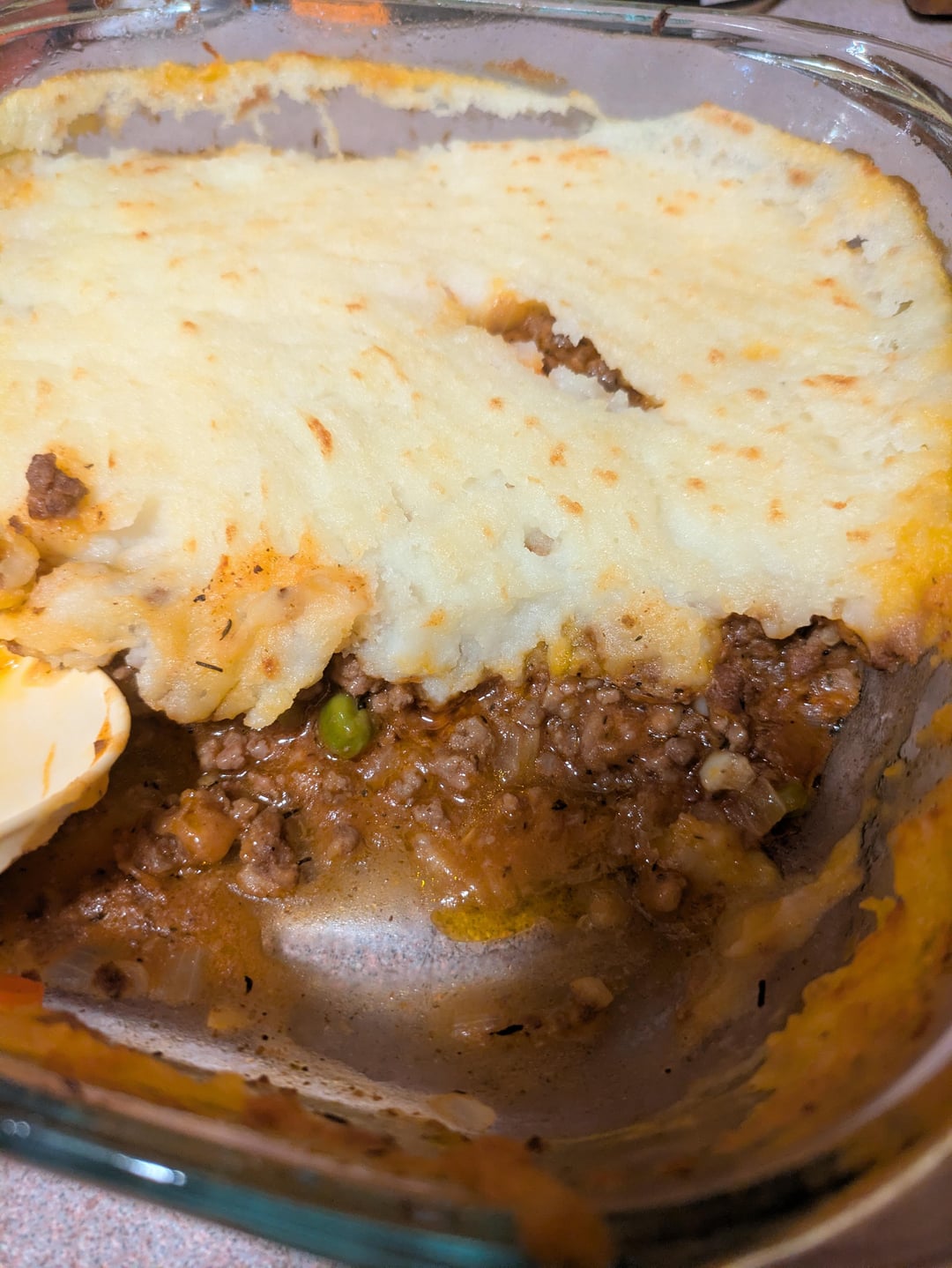 - Remove the bay leaf, then add the beef mixture to either an 8×8 inch baking dish or a pie dish. Put the mashed potatoes on top, then spread them out so they completely and evenly top the dish.