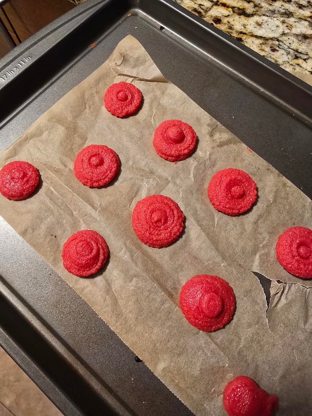 After many attempts, the shells finally turned out well (with feet!) 🌟 I realized what I was doing wrong. I had been trying to make powdered sugar, using granulated sugar and added a bit of cornstarch, which probably messed up the batter. This time, I just granulated sugar in the food processor without any cornstarch, and they turned out perfectly 😋 The last three photos show my earlier failed attempts ðŸ¤