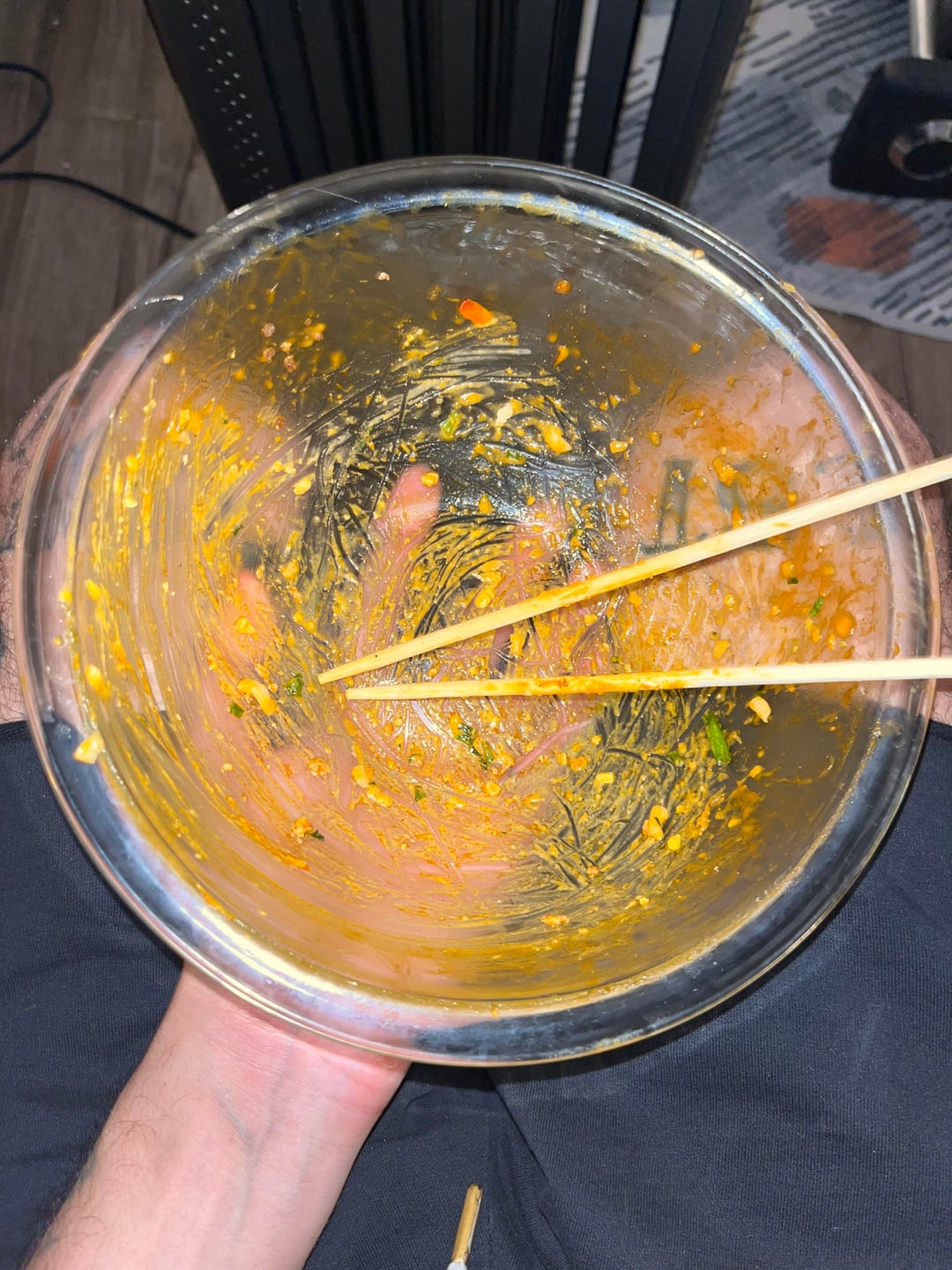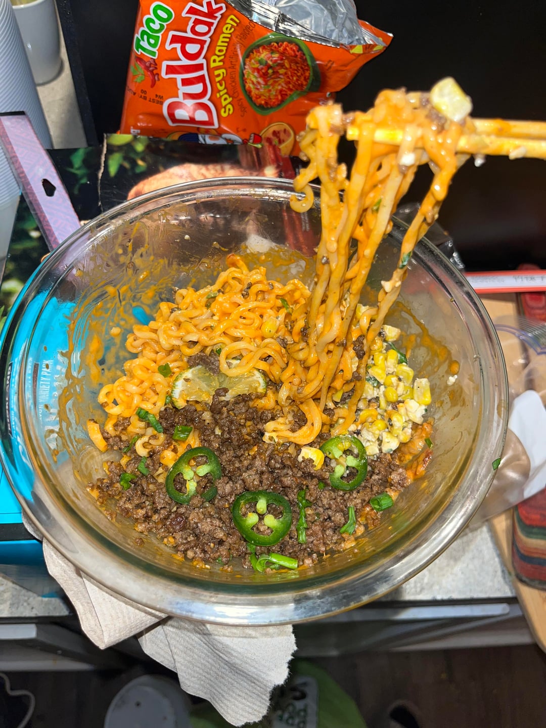 Pint of vodka in the gas tank. Taco ramen with esquites.