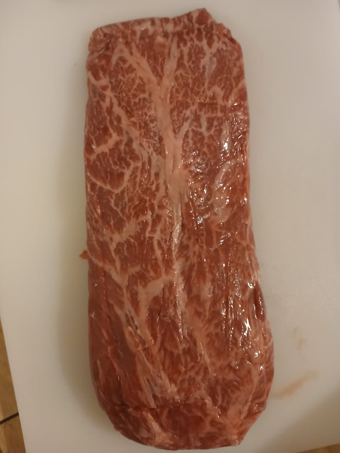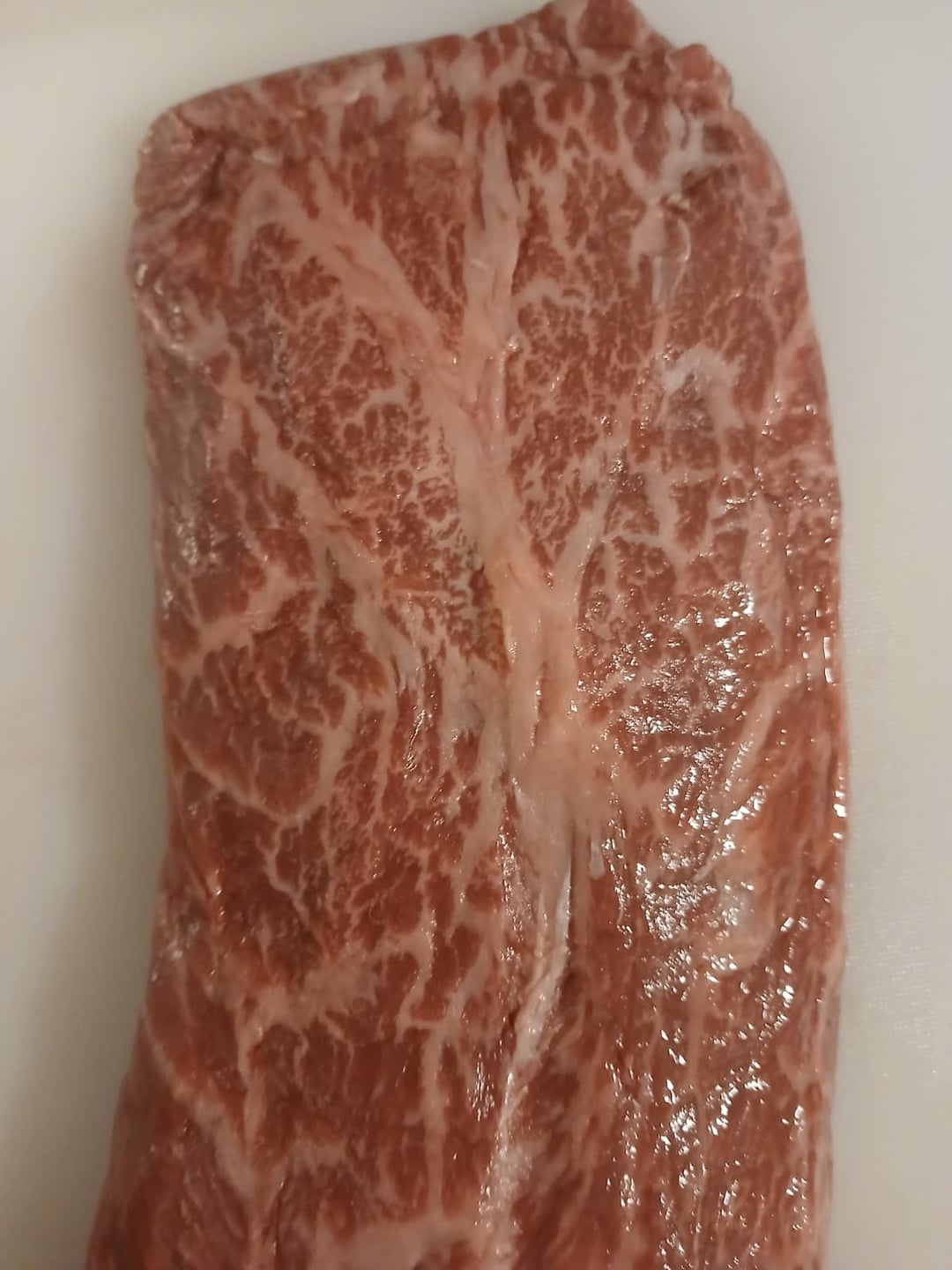 Here’s another grass finished flat iron from the ranch I work at. It IS possible for a cow to get this type of fat. Don’t listen to those that say otherwise. I literally just pulled this out of my personal freezer, just to take this pic. I also get to pick my stuff before I sell it. lol.