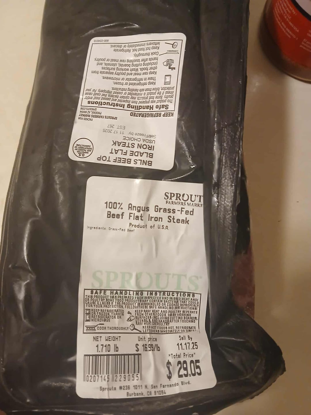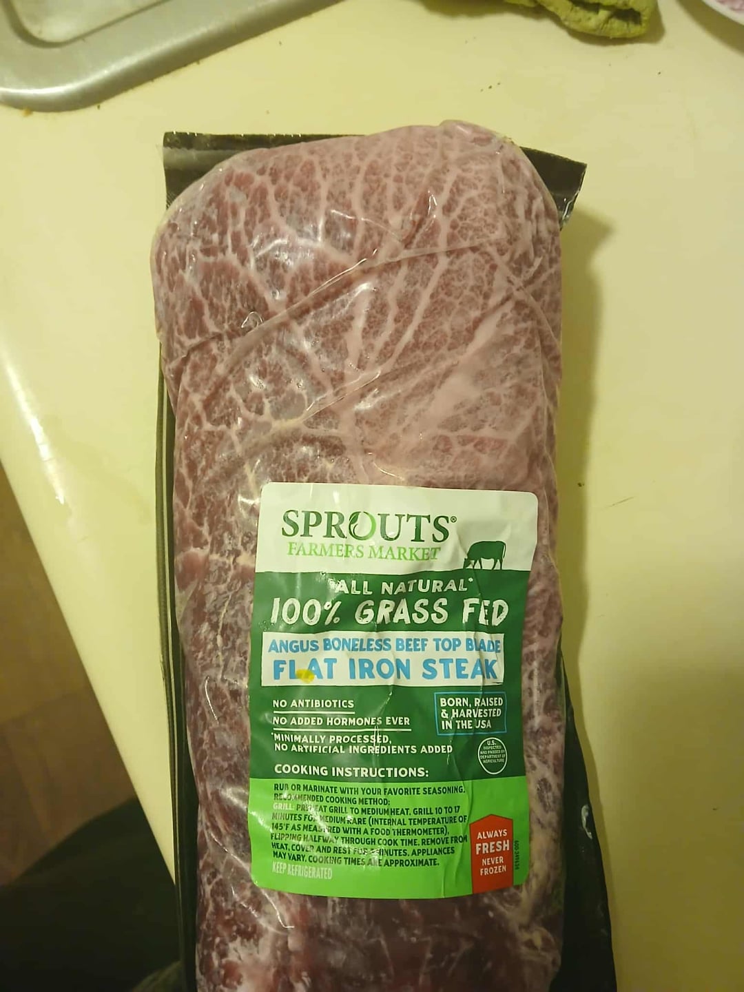 Flat Iron is my favorite cut. I’m not a fan of sprouts meat and yours is a big reason as to why. Grass-fed? Mmm no. This is grain-fed beef, probably finished so they could say “100% grass fed”. This marbling is consistent to not being grass finished. I don’t even think this is Angus. I eat angus flat iron steak 3 times a week. I had prime angus tenderloin and flat iron today.