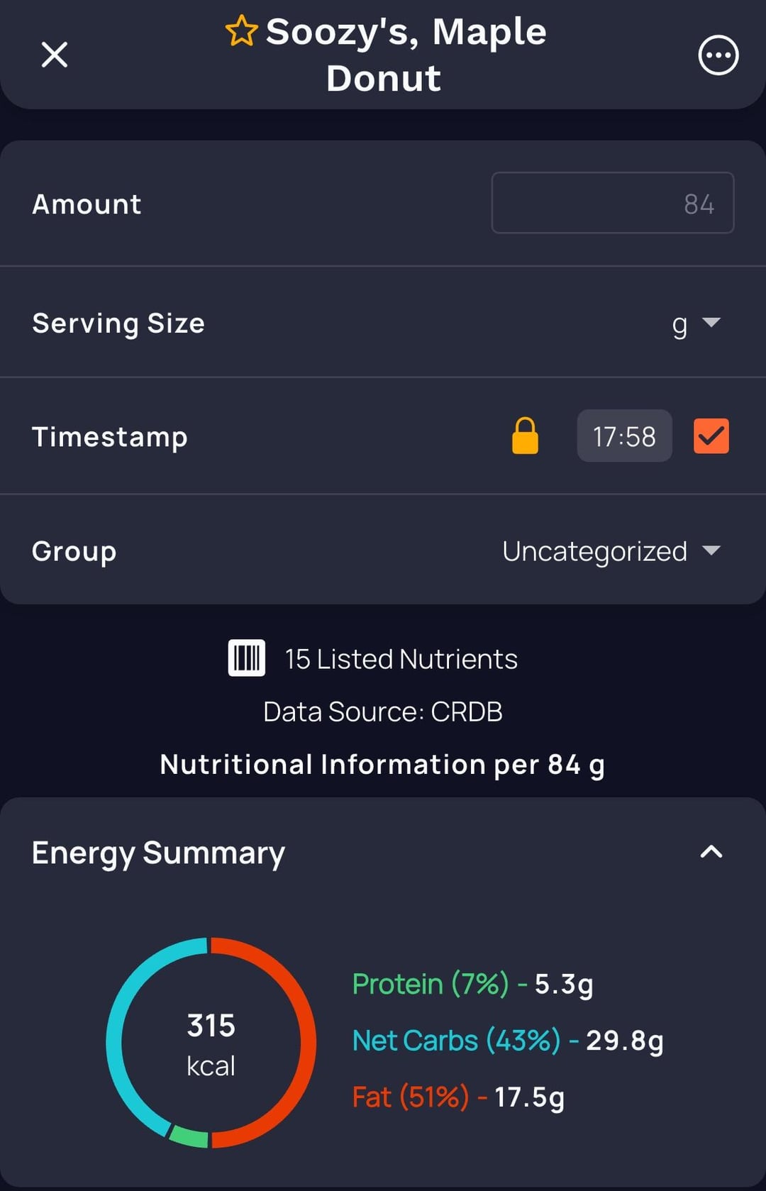 It was 84g and I entered it as 315 calories. by WaveLoss 1 Comment mingidubu 2 weeks ago Seems about correct