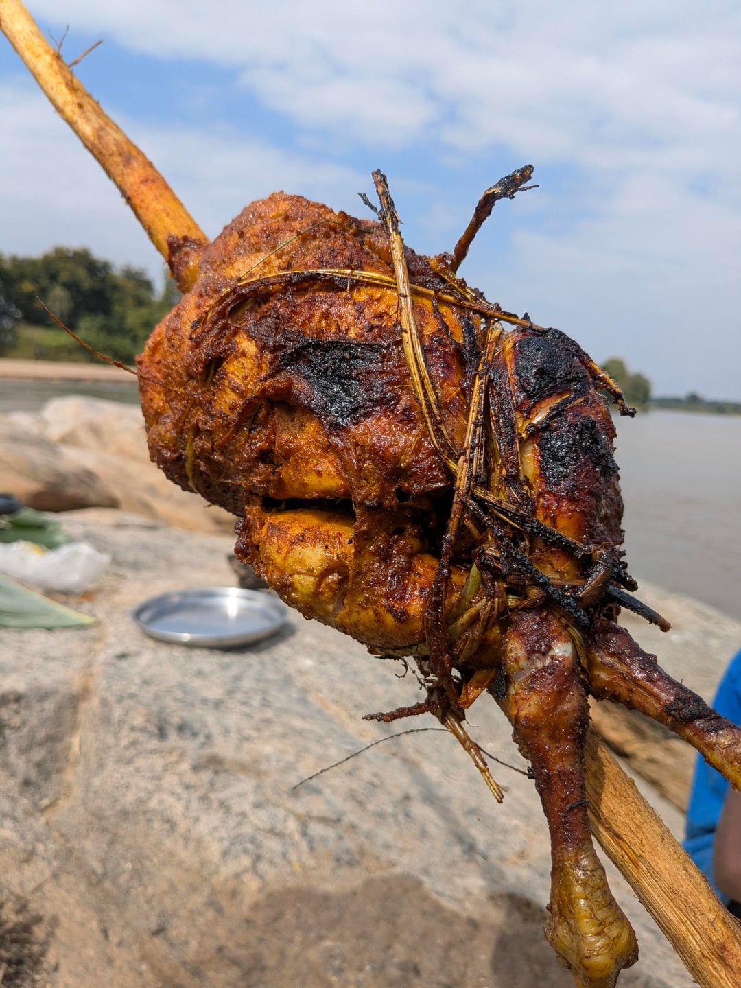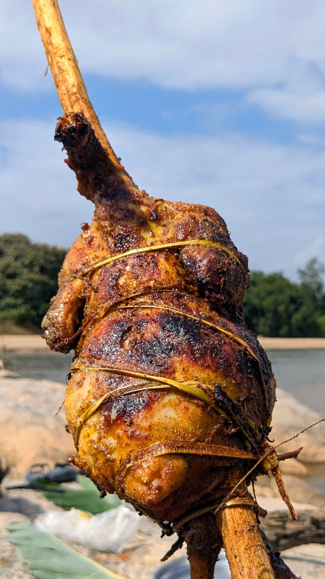 Outdoor cooking therapy. 🍗🔥 We roasted this whole chicken on a bamboo stick right next to the river. No fancy equipment—just a spicy marinade, an open fire, and some patience. The smoky flavor and the char you get from cooking it this way is unmatched.
