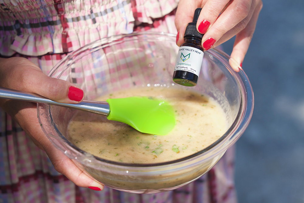 Simmer the rhubarb with sugar and water until softened. Add parsley and CBD oil, and whizz in the blender until pureed.