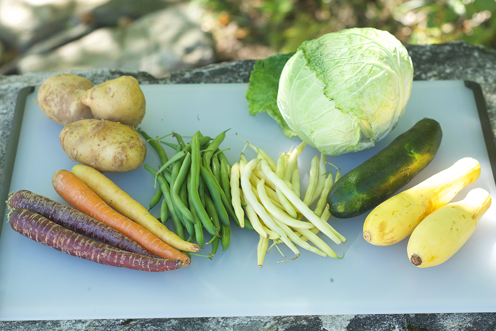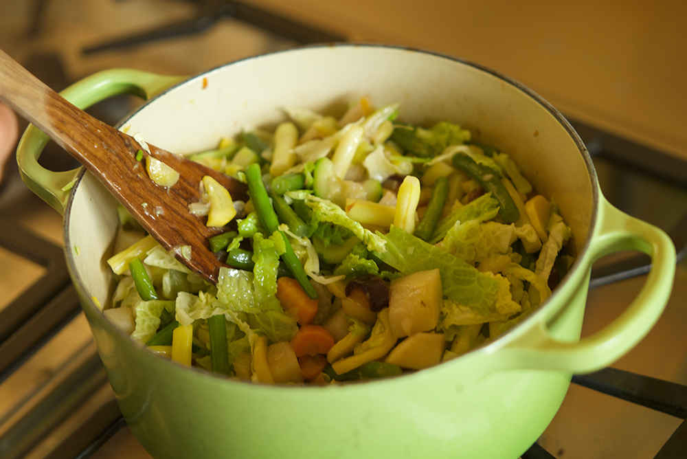 Choose a stockpot large enough for all the ingredients. Put in the oil, butter, and sliced onion, and cook over medium-low heat until the onion softens and is pale gold but not browned. Add the diced carrots, and cook for two to three minutes, stirring once or twice. Repeat this procedure with the celery, potatoes, white beans (if you’re using fresh beans), zucchini, and French beans, cooking each for a few minutes and stirring. Then add the shredded cabbage, and cook for about six minutes, giving the pot an occasional stir.