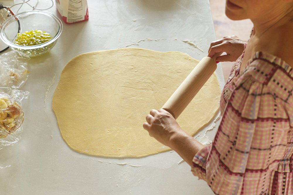 Coat the interior of a Dutch oven with the remaining two tablespoons of olive oil. Roll the pasta dough out into a large sheet, about an eighth of an inch thick. Lift the dough and carefully press it into the Dutch oven, making sure that around six inches hangs down outside the vessel.