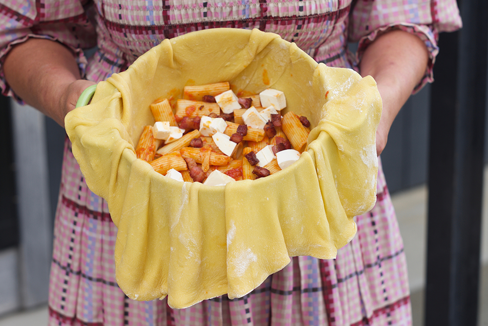 Toss the cooked pasta in the sauce. Start filling your timpano with a layer of pasta, followed by half of each one of the fillings in layers: eggs, pancetta, mozzarella, sausage, provolone. Repeat, starting with the pasta, until the timpano is filled to the brim, ending with a layer of provolone. Carefully fold the excess dough over the top, and press to seal.