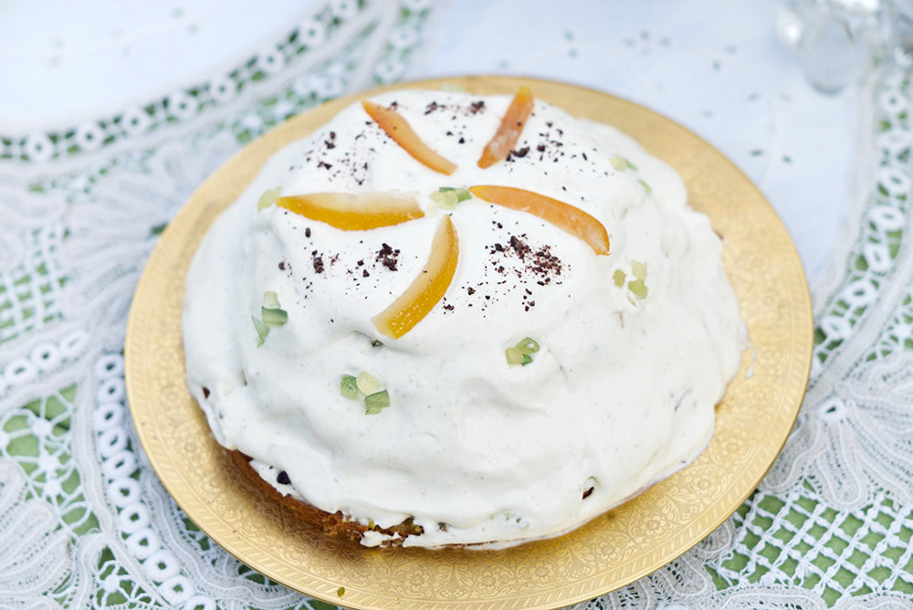 Assemble the cake starting with a layer of sponge, followed by a layer of pistachio paste, a layer of ricotta cream, a liberal sprinkling of chocolate, and a dusting of cinnamon. Repeat with the seven-inch and six-inch layers, and top with the five-inch round. Cover with the whipped cream, and decorate with slices of candied orange and citron, whole pistachios, and a sprinkling of chocolate or cinnamon, as desired.