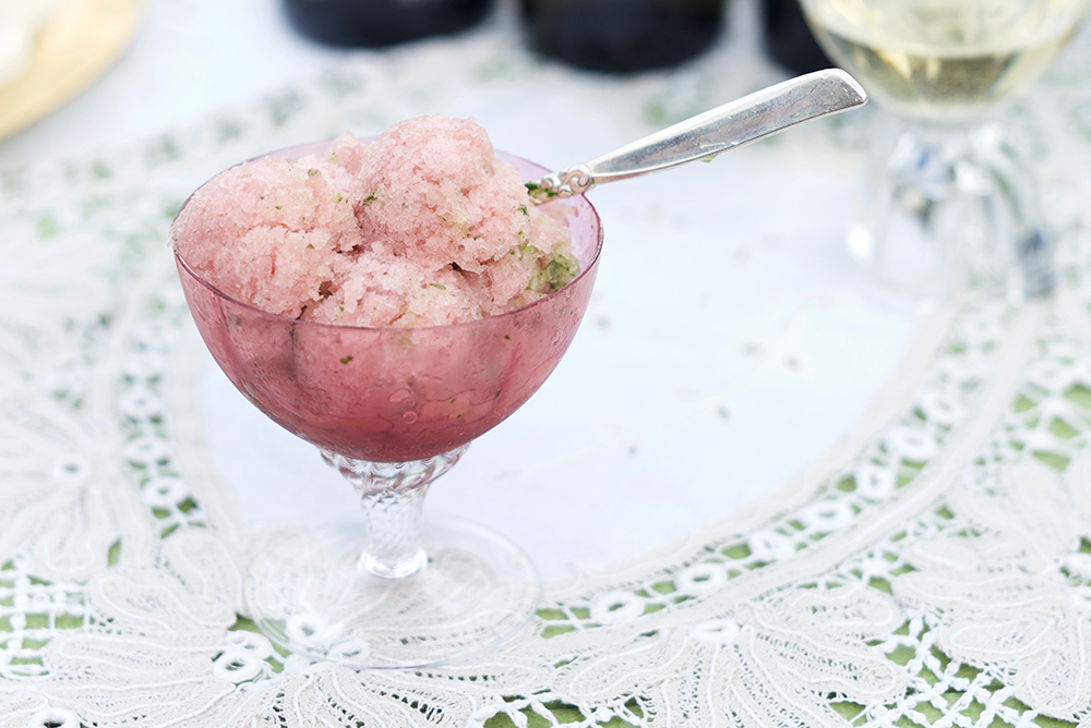 Lastly, I tried to track down a “spiced and drugged sherbet” mentioned in one of the book’s most famous quotes. What could “drugged” have meant in the context of 1860s Sicily? Lanza told me that the spice mentioned in the Italian original was cinnamon and that “drugged” was an incorrect translation of the word scorzonera—salsify! I thought a cinnamon-and-salsify dessert sounded intriguing, but since salsify is out of season, I went with my original misunderstanding and made a seasonal granita of rhubarb, spiked it with CBD oil for the “drugged” part, and added some parsley to give it some of the savory profile of the original.