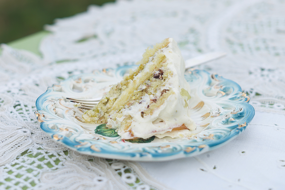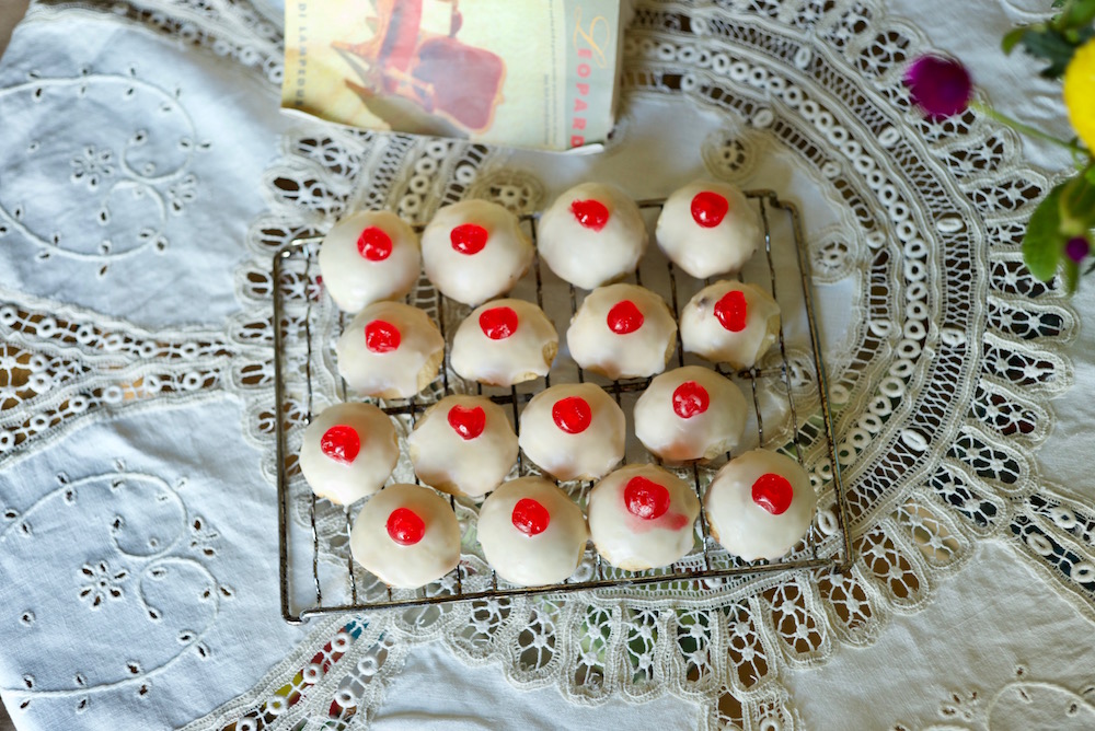 My sweets are inspired by a ball that takes place in The Leopard’s final chapters, dishes whose savory offerings were described as having an unappetizing “monotonous opulence”—all for the best, since I did not want to cook “coralline lobsters boiled alive,” “waxy chaud-froids of veal,” or “steely tinted fish immersed in sauce.” The desserts are “huge blond babas, Mont Blancs snowy with whipped cream, cakes speckled with white almonds and green pistachio nuts, hillocks of chocolate-covered pastry … pink ices, champagne ices, coffee ices, all parfaits which fell apart with a squelch as the knife cleft them, melody in major of crystallized cherries, acid notes of yellow pineapple, and those cakes called ‘triumphs of gluttony’ filled with green pistachio paste, and shameless ‘virgin’s cakes,’ shaped like breasts.”