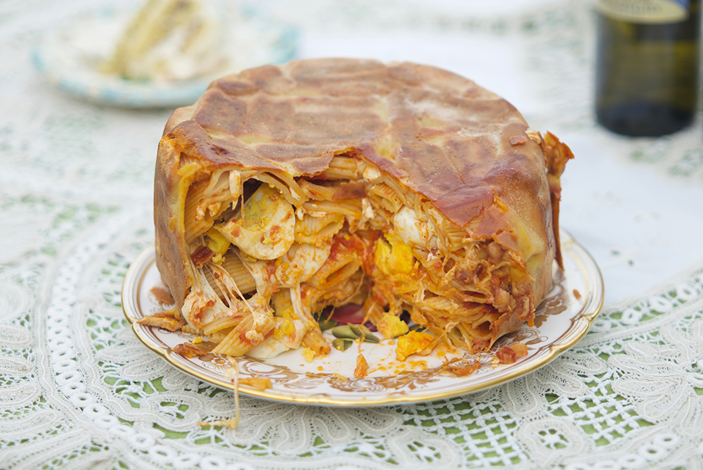 The guests at this meal show “pleased surprise” when lackeys “in green, gold and powder” reveal “a towering mound of macaroni” later described as having a “burnished gold” crust, a “fragrance of sugar and cinnamon,” and, when the knife breaks the crust, “a mist laden with aromas, then chicken livers, hard boiled eggs, sliced ham, chicken, and truffles in masses of piping hot, glistening macaroni, to which the meat juice gave the exquisite hue of suede.” “Macaroni” is a generic usage, Lanza told me; the dish is a timpano, a spectacular layered pasta creation wrapped in dough and then baked, which has a cameo in the film Big Night and can have any number of fillings. (Melissa Clark even makes a healthy option with butternut squash and broccoli rabe for the New York Times.) I filled my timpano with “sliced ham” (or, as Lanza said, “pancetta”), hardboiled eggs, cheeses, and rigatoni in red sauce. It was delicious, not really much more laborious than lasagna and massively more showstopping.