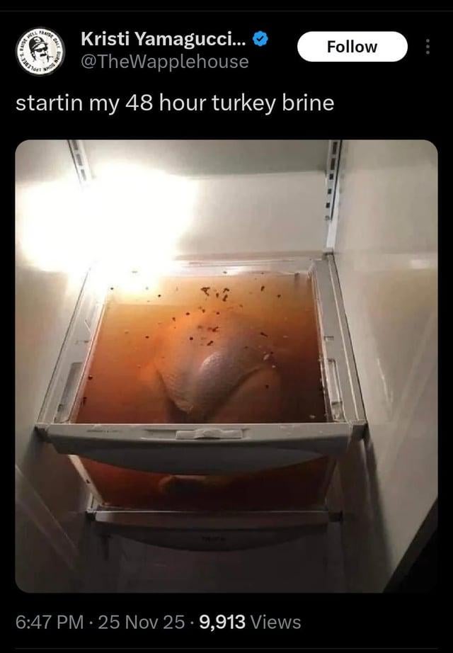 This is both stupid and *somewhat* clever. I don’t own anything large enough to brine a turkey that big. As long as you clean the drawer well before and after, there shouldn’t be a problem. The lower drawer might’ve made more sense, though; you could pull out the top one to ladle in/out the brine before moving the turkey, so all the liquid doesn’t slosh around too much. You could even use a fluid transfer pump (just to drain it into a bucket).