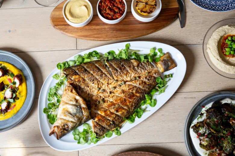 Zaytinya’s Mediterranean sea bass grilled whole and partially deboned, served with yellow squash skordalia, sun-dried tomato tapenade and salt-cured capers. Courtesy Zaytinya.