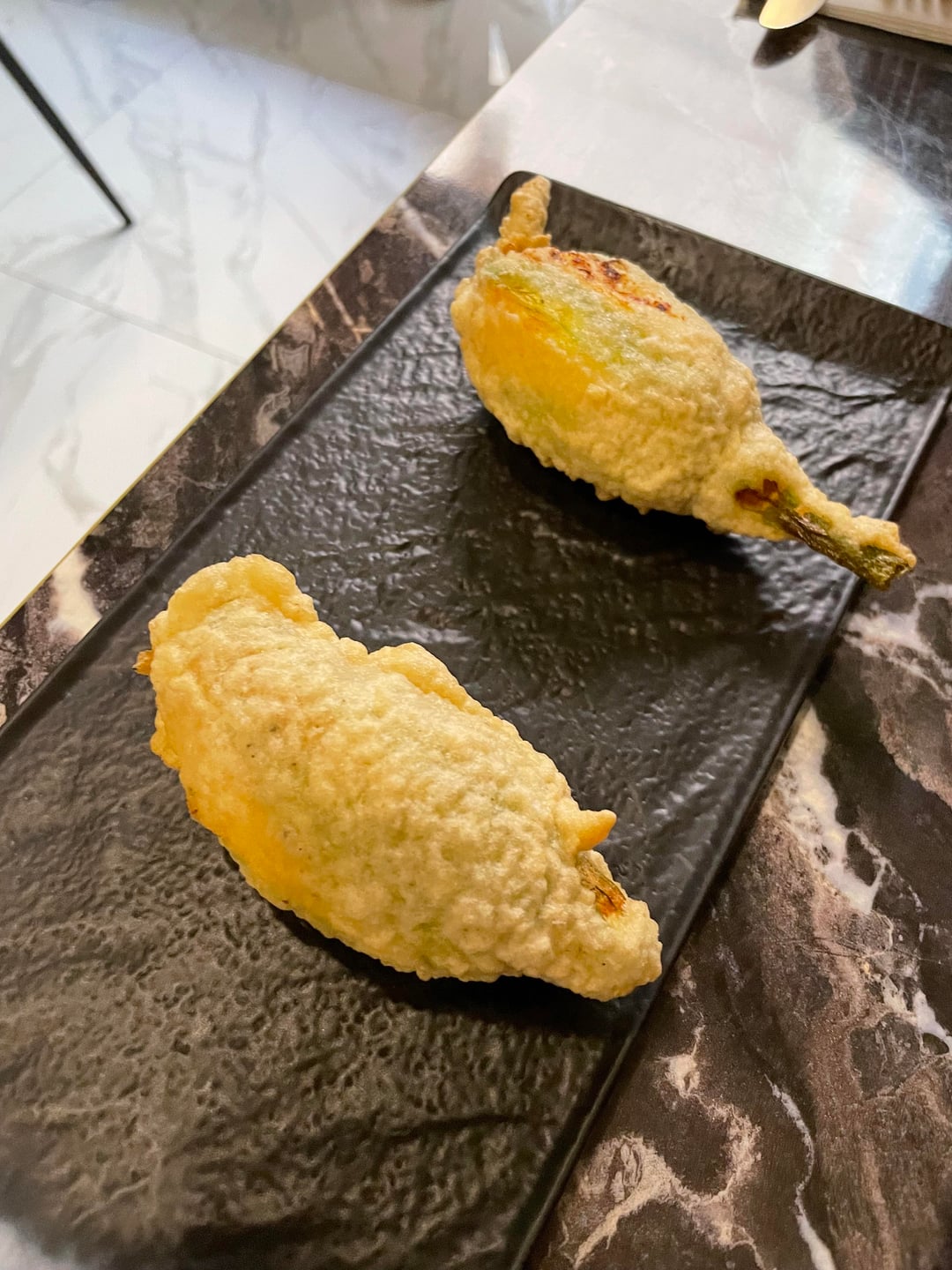 – Pizza with Pancetta, Zucchini, and Zucchini Blossom – Pizza with Pumpkin Cream and Sausage – Battered Zucchini Blossoms – Typical dessert from the Neapolitan restaurant Borbonika – Caprese Cake from the traditional Scaturchio pastry shop