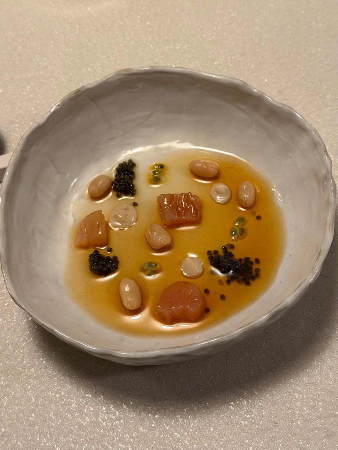 Peanuts, tendons, caviar, passionfruit and roast