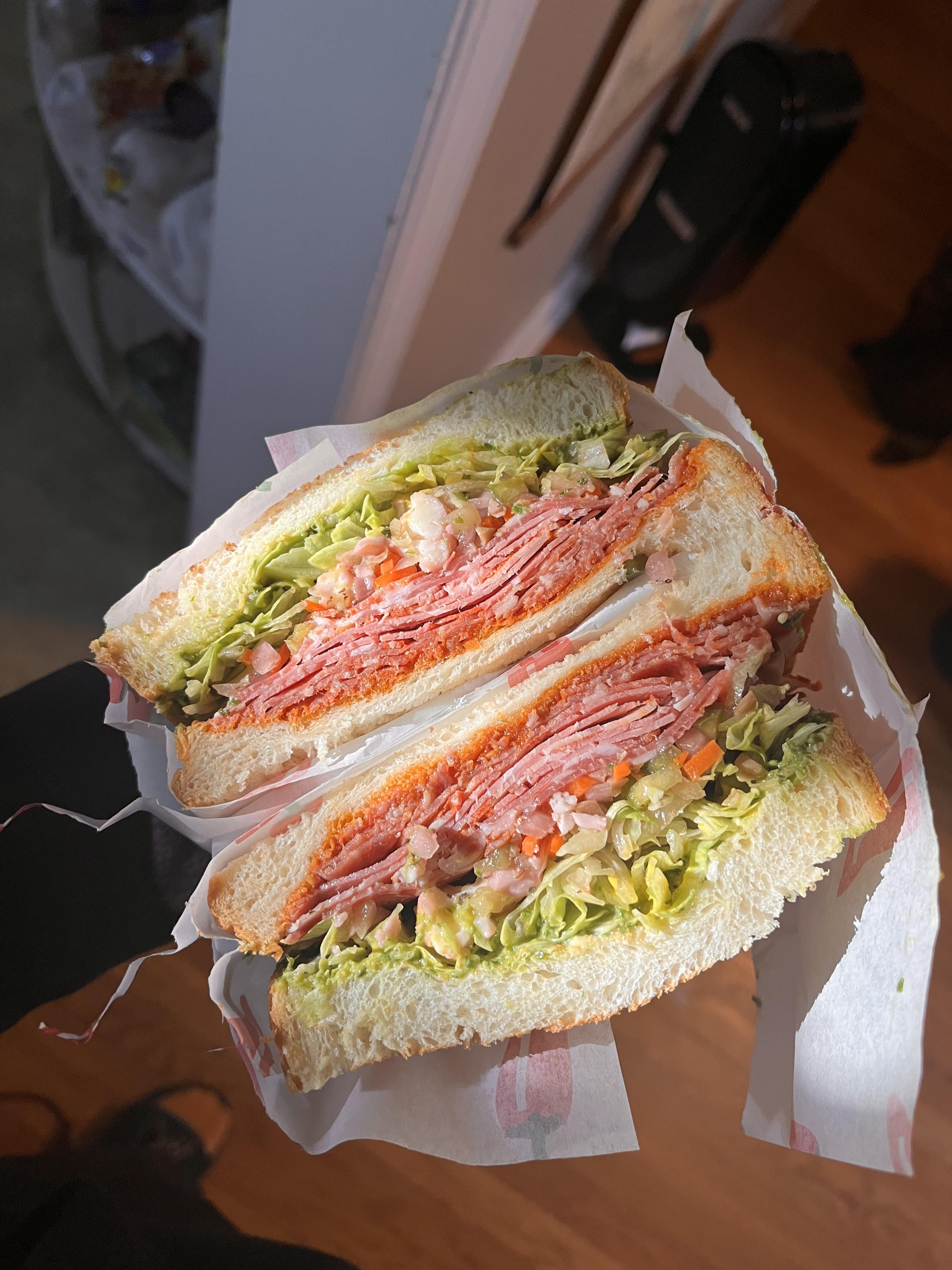 It’s got basil pesto, sun dried tomato pesto, yellow mustard, giardiniera, meat, iceberg lettuce.