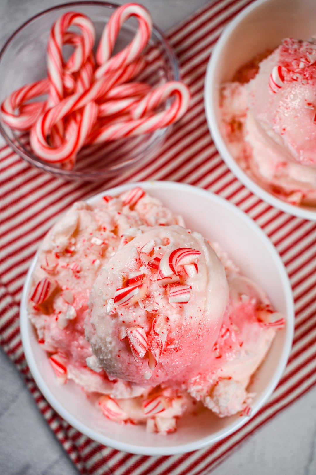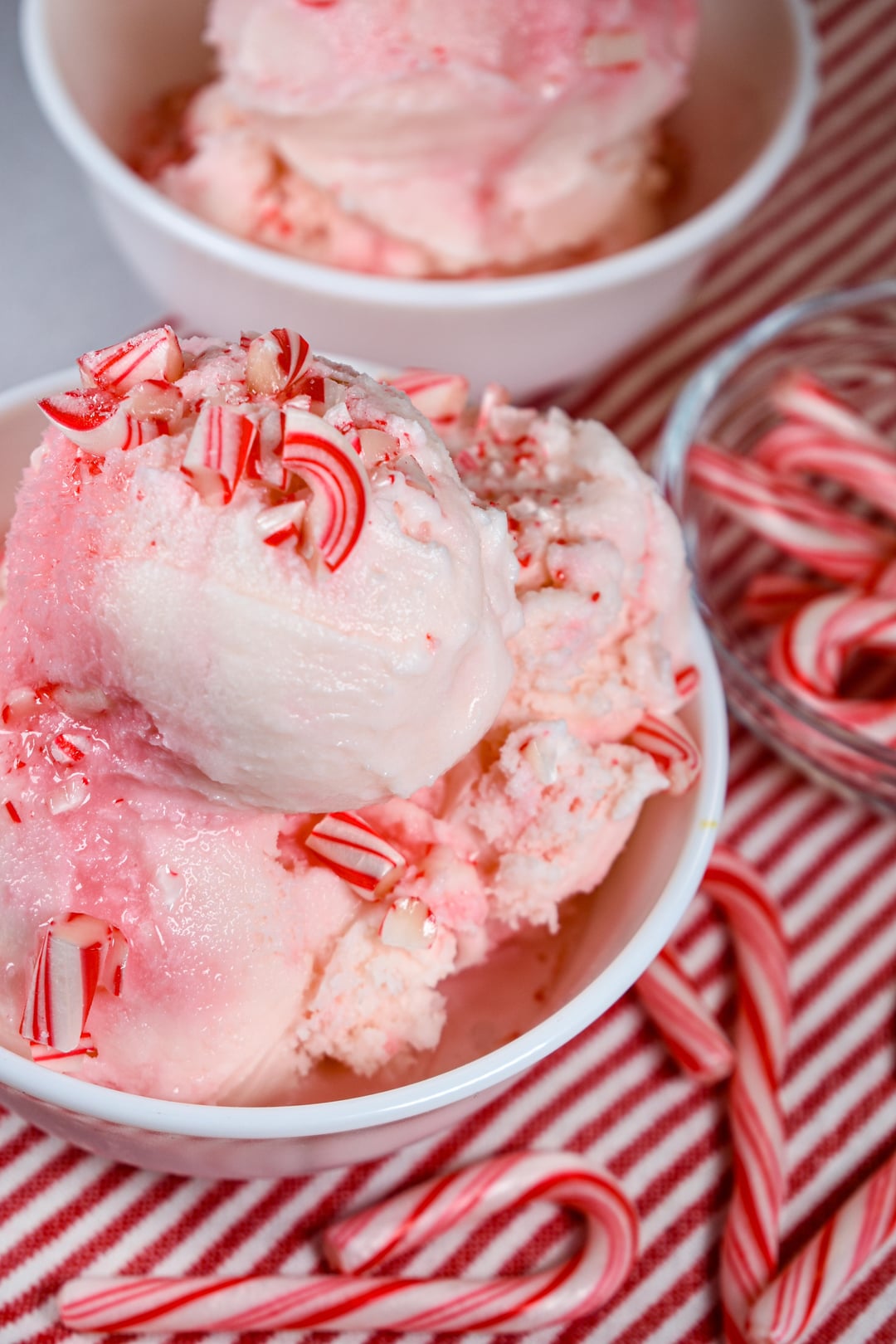 Homemade peppermint ice cream flavored with natural peppermint oil and bits of crushed candy cane.