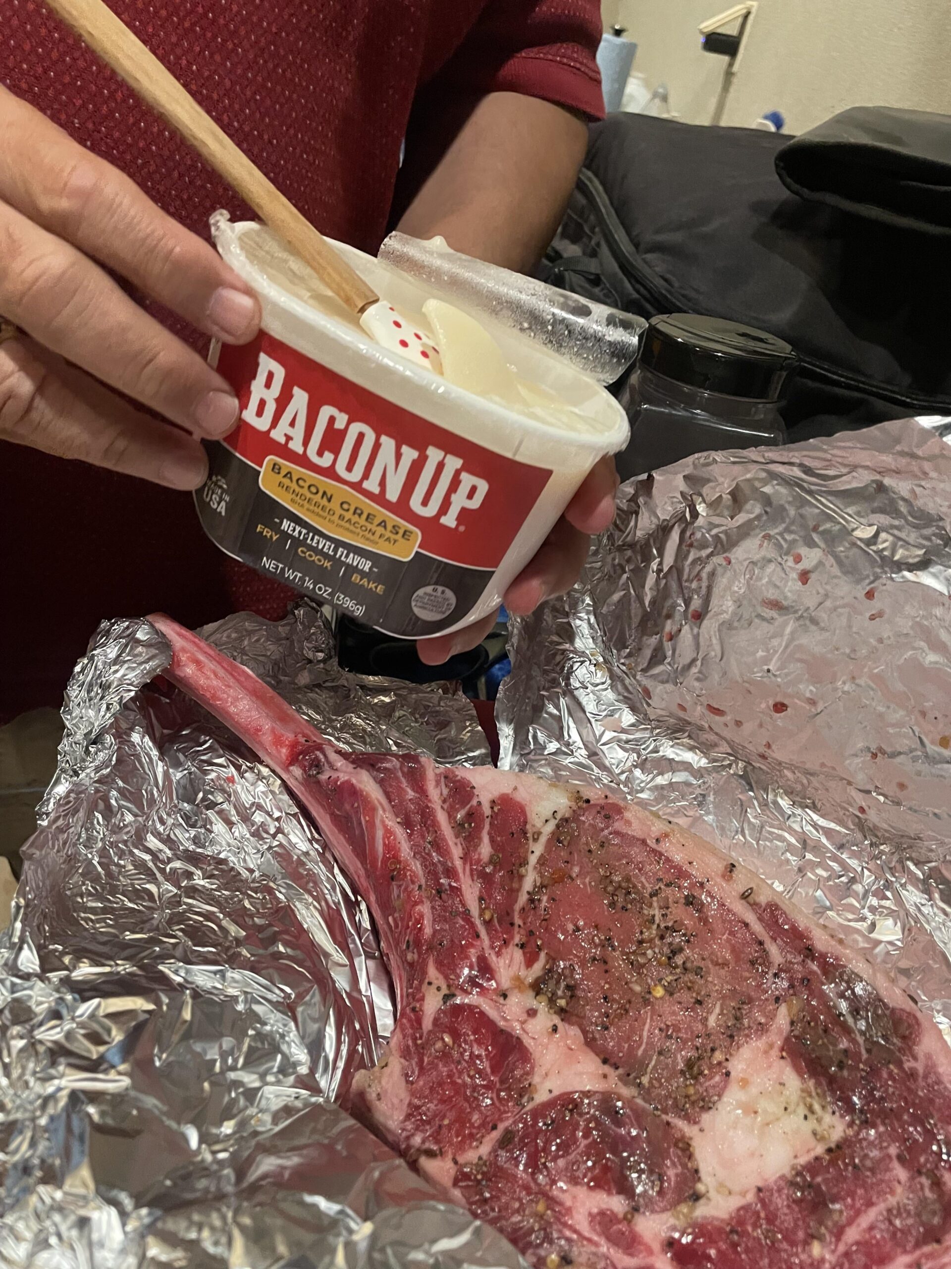 There is duck fat in a jar now. Its better than this for a flavorful cut of beef like this. Also, there is enough fat in that tomahawk for you to just use some by healthy olive oil instead. Especially since you are smothering it in foil.