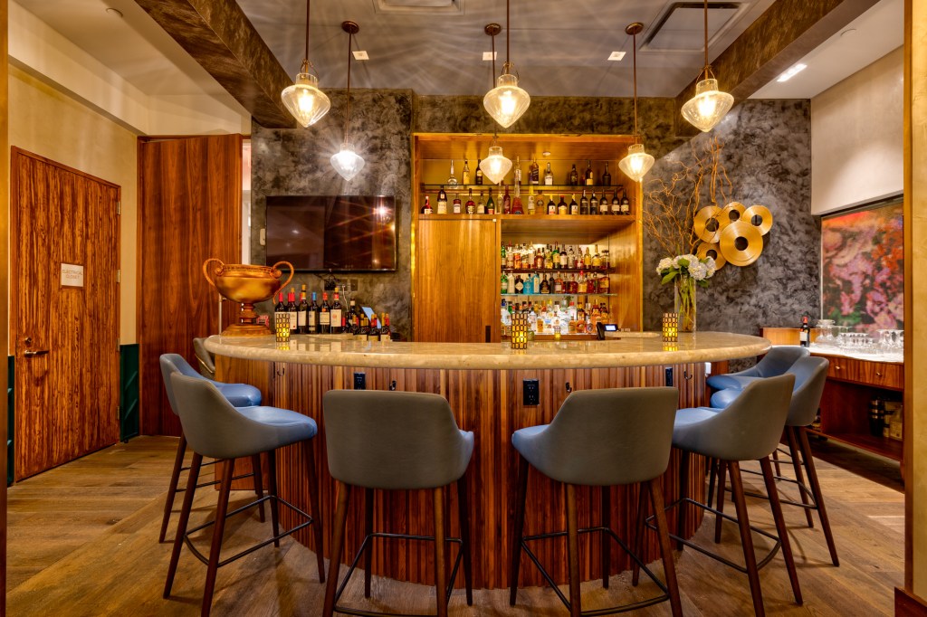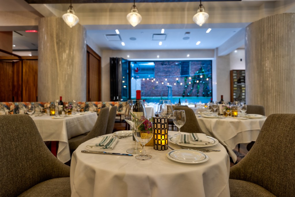 The restaurant was designed in collaboration with the owner and Paul Vega, founder of VLDG Design, to emphasize the large dining room with smart and elegant accents of millennial blue and venetian plaster, wine displays, and large mosaiced columns. The tranquil outdoor patio is lined with greenery to provide an oasis in Midtown Manhattan.