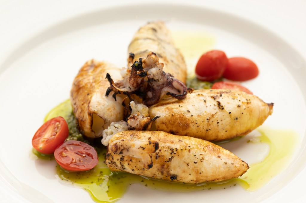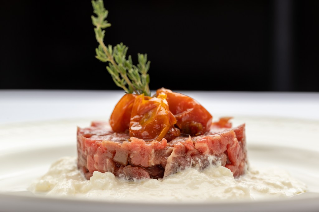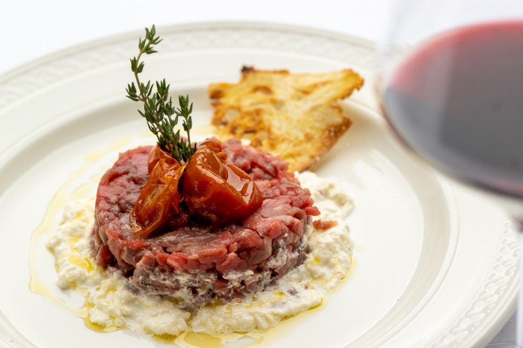 The meal begins with fresh bread accompanied by Soppressata and 36-month aged Parmigiano-Reggiano,compliments of the chef. A large selection of Antipasti includes highlights: Carciofi e Avocado, artichoke hearts tossed with avocado and topped with Parmigiano-Reggiano; Cavolfiore Gratinati, cauliflower in creamy bechamel sauce with 34-month aged Parmigiano-Reggiano; and Tartar di Fileto, beef filet tartar over cream of burrata. The Insalate are clean and showcase seasonal produce, a classic Caesar Salad for two prepared tableside, and Ramerino, mixed greens, walnuts, pear, goat cheese, a lemon dressing.
