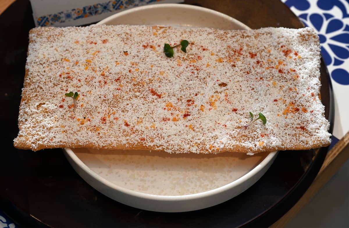 Pane Carasseau Erbe Misto: This thin flatbread is herb-forward and aromatic, baked with mixed herbs and lemon. A perfect snack on its own or paired with mains. We love the shaved goat’s cheese sprinkle on top.