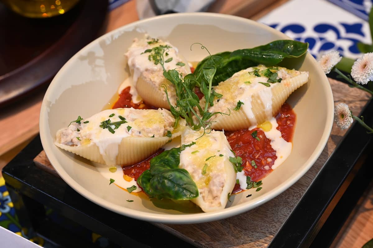 Herb Chicken Conchiglie: Stuffed pasta shells with melty cheese and tomato salsa create hearty comfort. Herb chicken adds protein without overpowering the flavours.