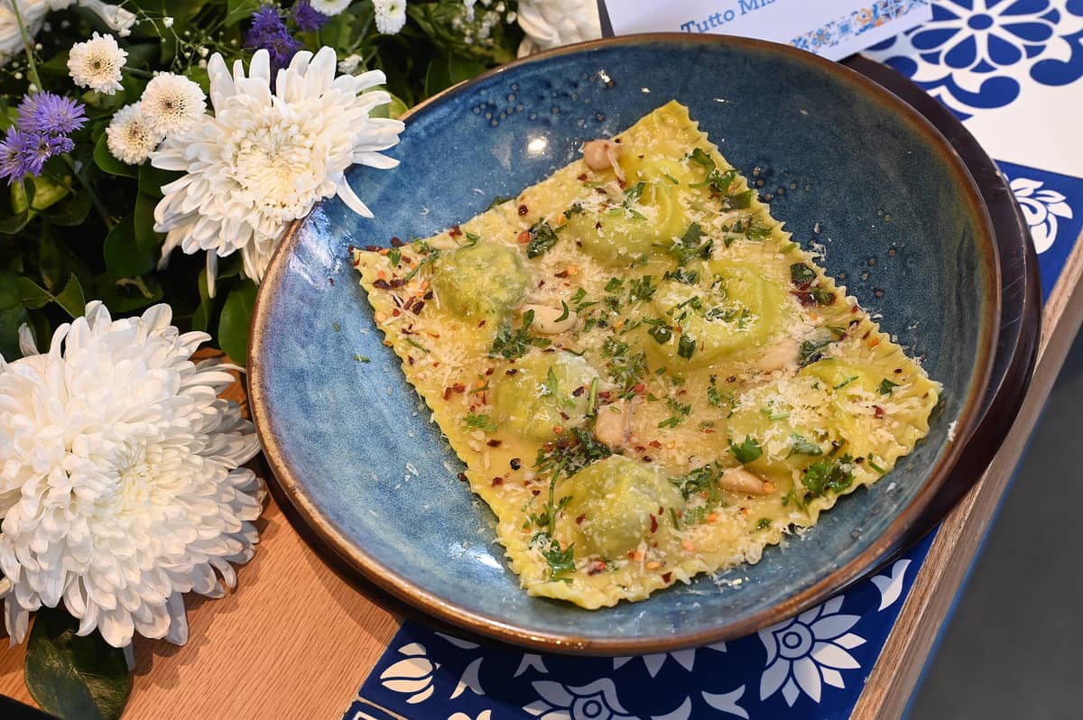 Tutto Misto Ravioli: A trio of fillings — pecorino, spinach ricotta, and garlic butter — create a richly layered flavour journey. The ravioli is served in a grid format, further adding to its appeal.