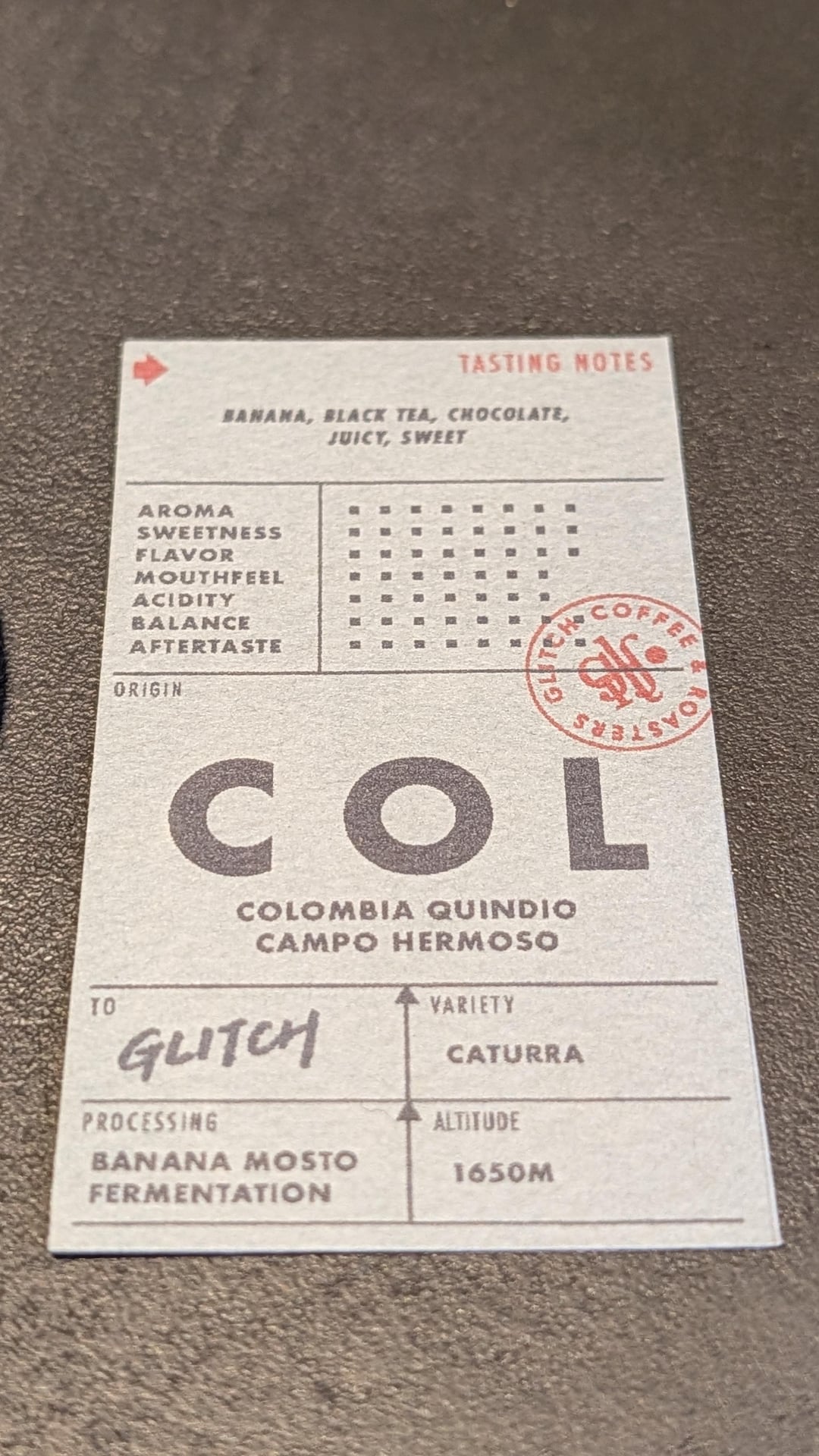 This was amazing. I texted my mom "holy fucking shit." I have been making home espresso for over a decade and have gotten my Cortados down pat. I live in Chicago, and I only have experienced a couple of cafe Cortados as good as my own. This blows mine and every other Cortado out of the water. The banana was perfect and emphasized and complemented by the sweetness of the milk, and I got just a nice hint of the chocolate. Maybe a little bit a the tea, as well, but I think it being a milk drink sort of moved the juiciness into the background.