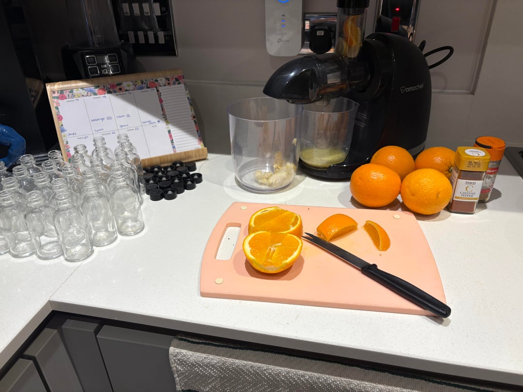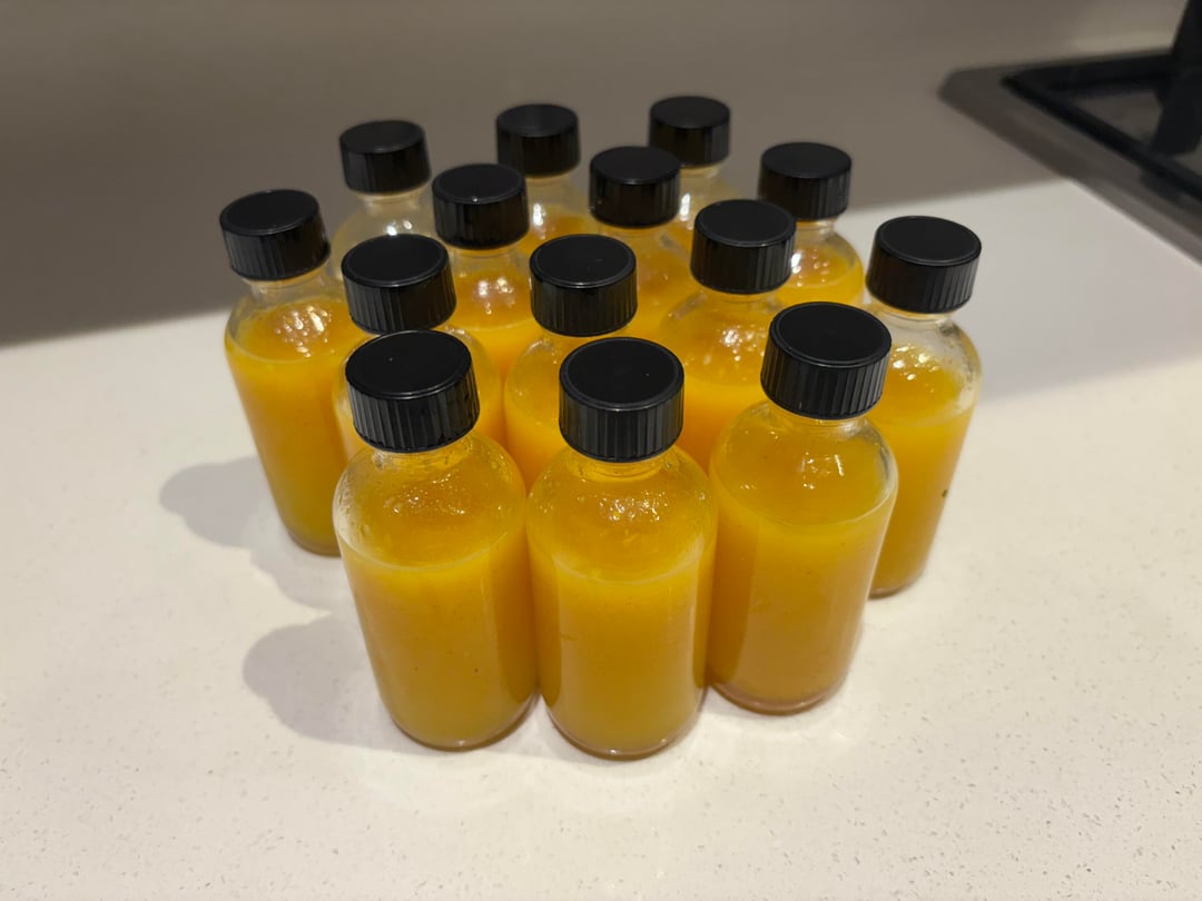 1st photo: booster shots (oranges, lemon, ginger, turmeric, cayenne pepper, black pepper, water)