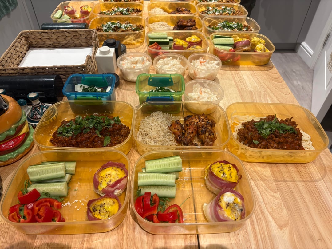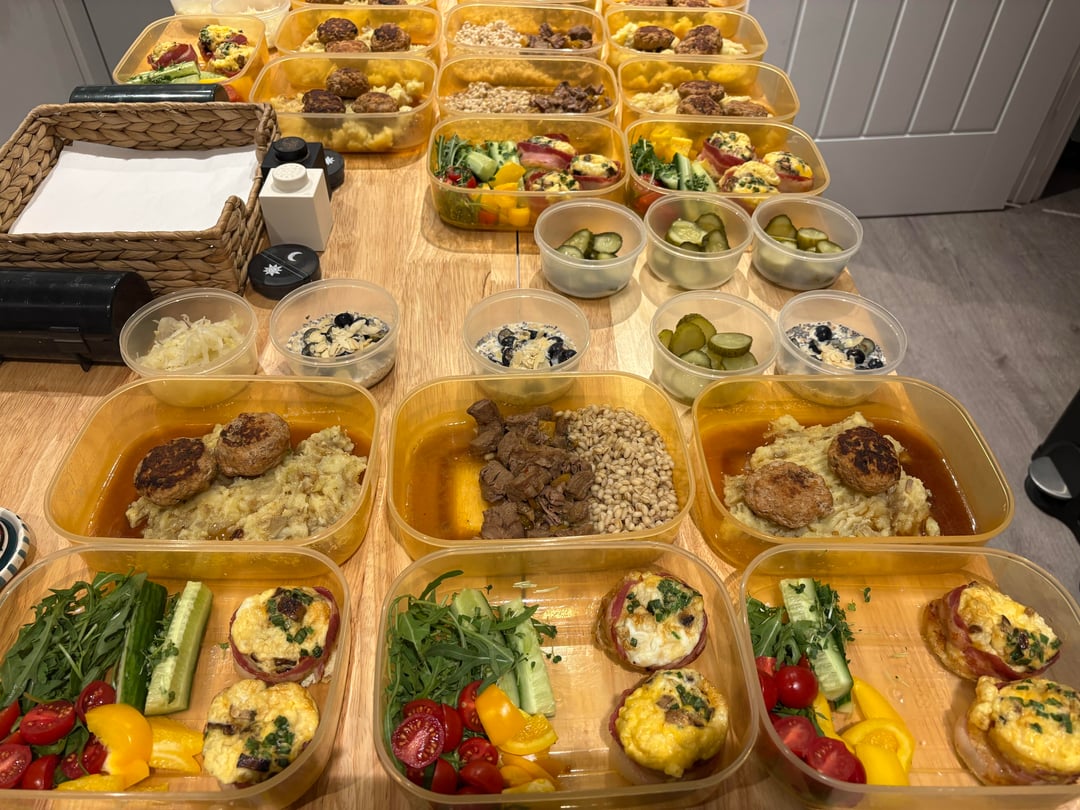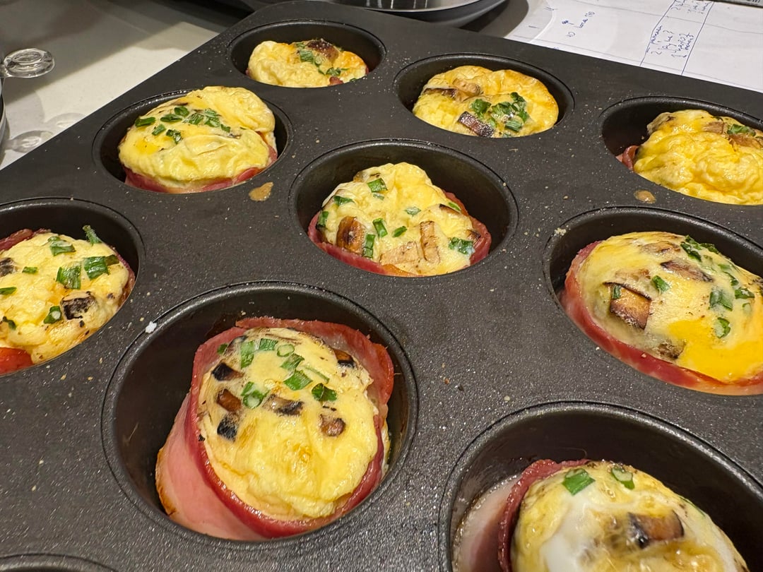egg muffins: eggs, bacon, mushrooms, chives, salt, pepper) 15minutes in 180•. (for breakfast with veggies on the side: rocket salad, cucumber, tomatoes, peppers)