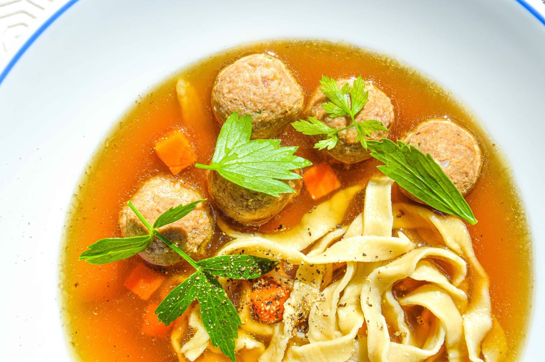 Rosół wołowy – a riff inspired by a Polish Sunday staple, served with meatballs and egg noodles