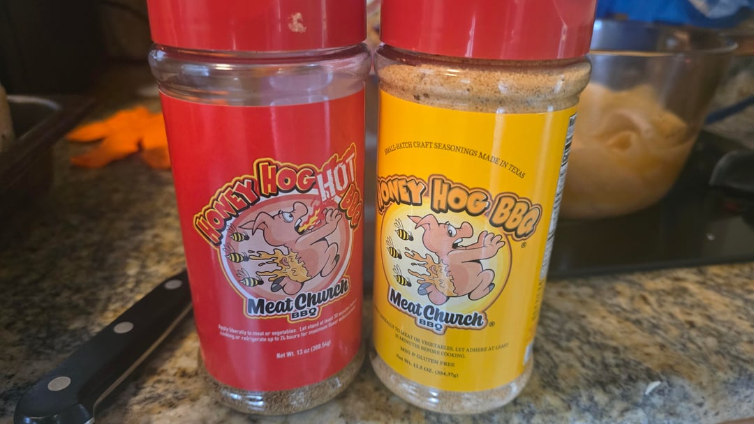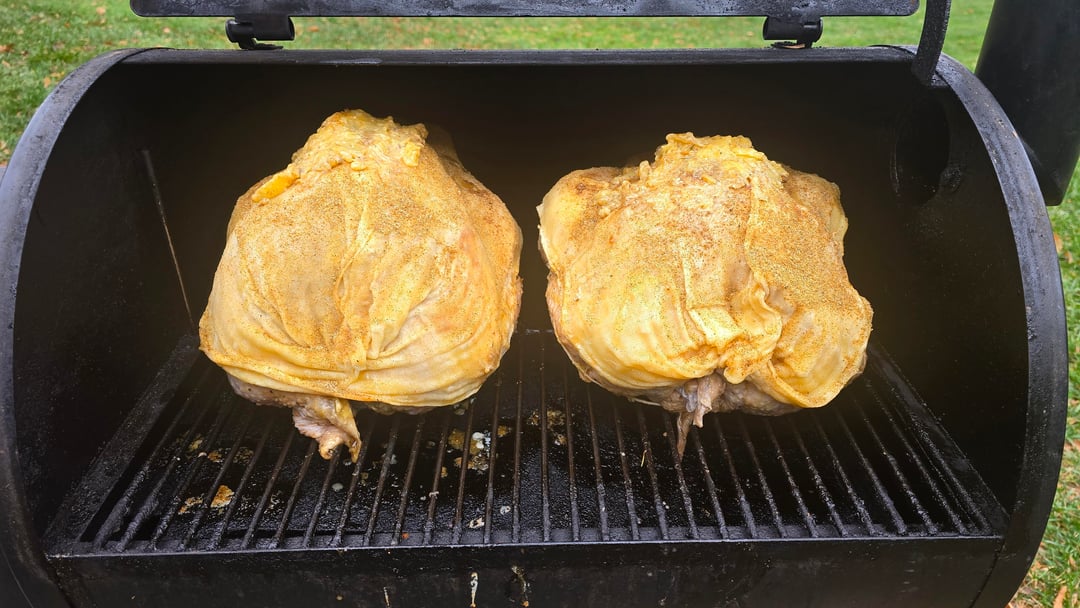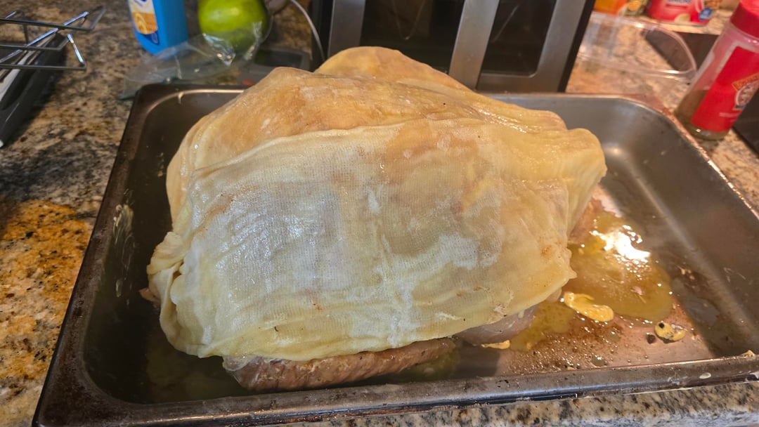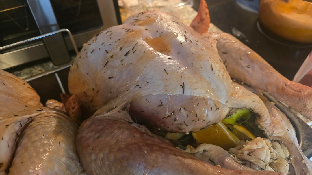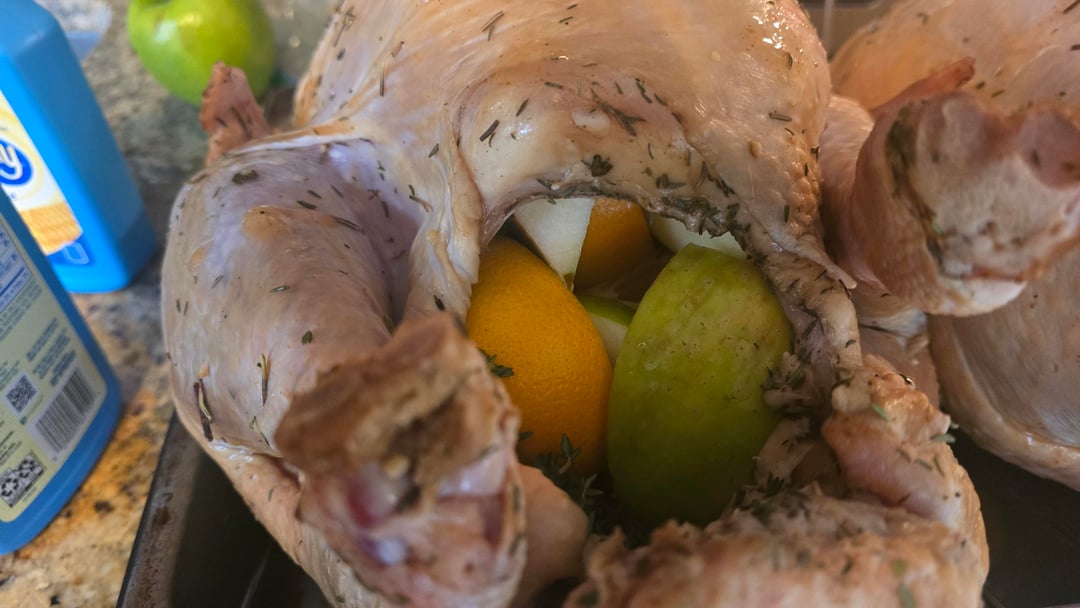 Sweet tea brined, stuffed with green apple and orange. Tony Chachere injected, margarine skin, dusted with Honey Hog, cheesecloth soaked in butter, dusted again with Honey Hog Hot.