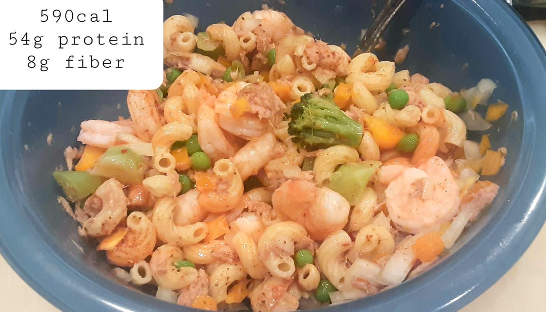 This was mostly prepped early in the day. I took out 1 serving of frozen shrimp to thaw. Later, I boiled 1 serving (2oz) of macaroni. When the noodles were done I tossed in 1 serving of frozen broccoli and frozen peas. Strained and rinsed in cold water to stop the cooking process. While those were cooking I chopped up the bell pepper and onions and placed them into the bowl, poured in the cooled noodles and vegies. I then drained a can of tuna fish and placed it throughout the bowl. I then measured 1 serving of zesty Italian dressing and added it to the bowl, added black and red pepper, mixed everything and put it in the fridge. At dinner time I pan cooked the shrimp until done and placed on the cold salad, added old bay and hot sauce and ate. It was A LOT and I am thoroughly full.