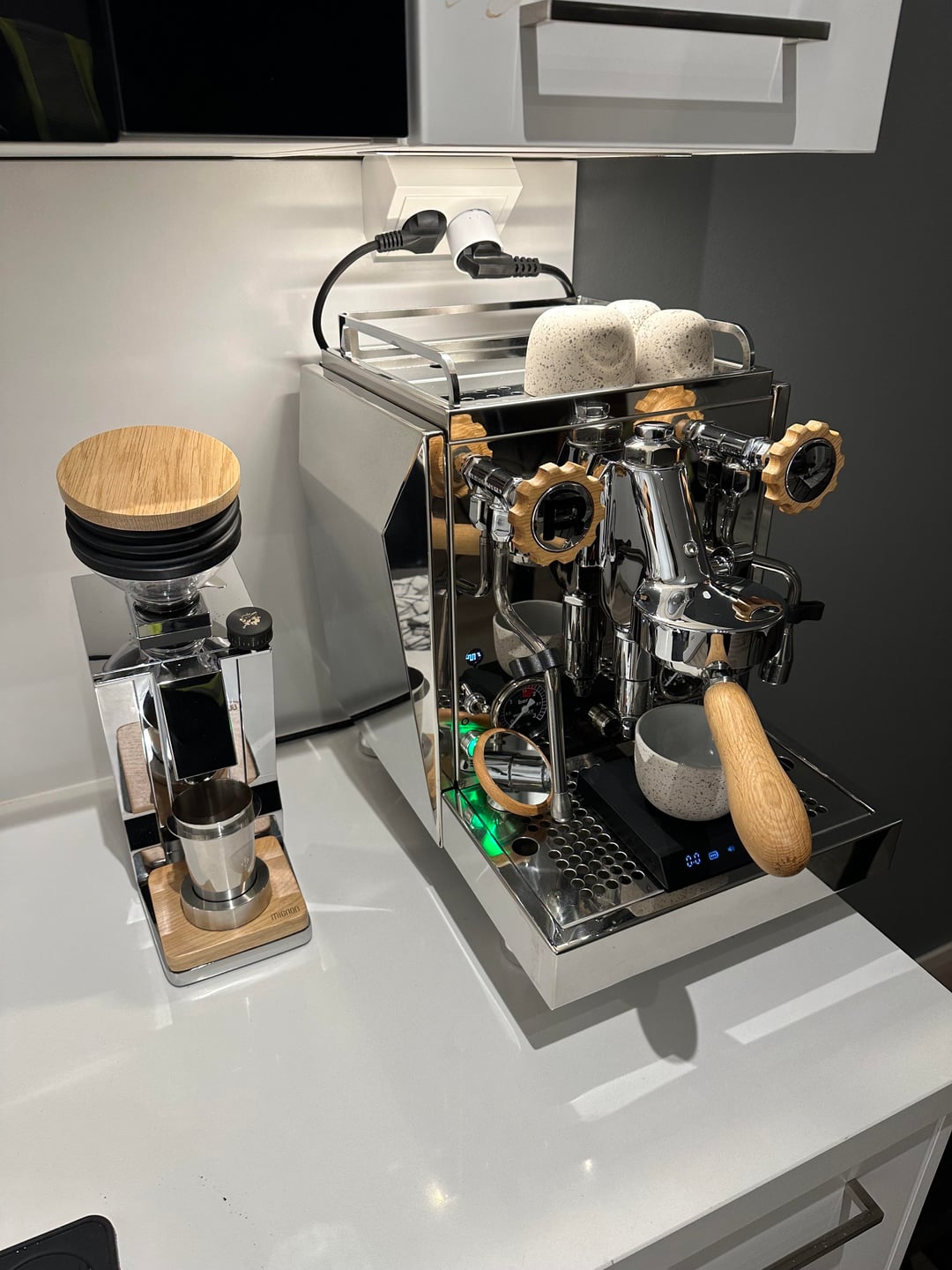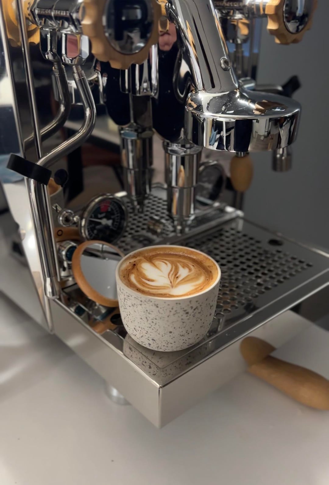 Rocket Espresso Mozzafiato Chronometro R (very short name) with some wooden parts and bottomless portafilter