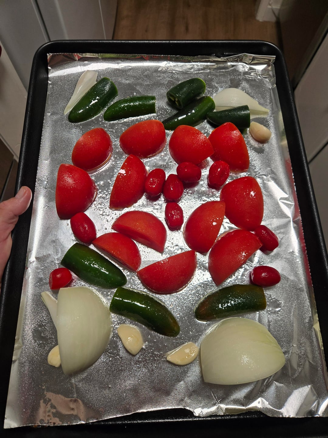 I roasted the tomatoes, onion, jalapeños, and garlic under the broiler for about 20 minutes. This time I placed the pan closer to the flame and got a much better char, which was a huge improvement over my first batch.