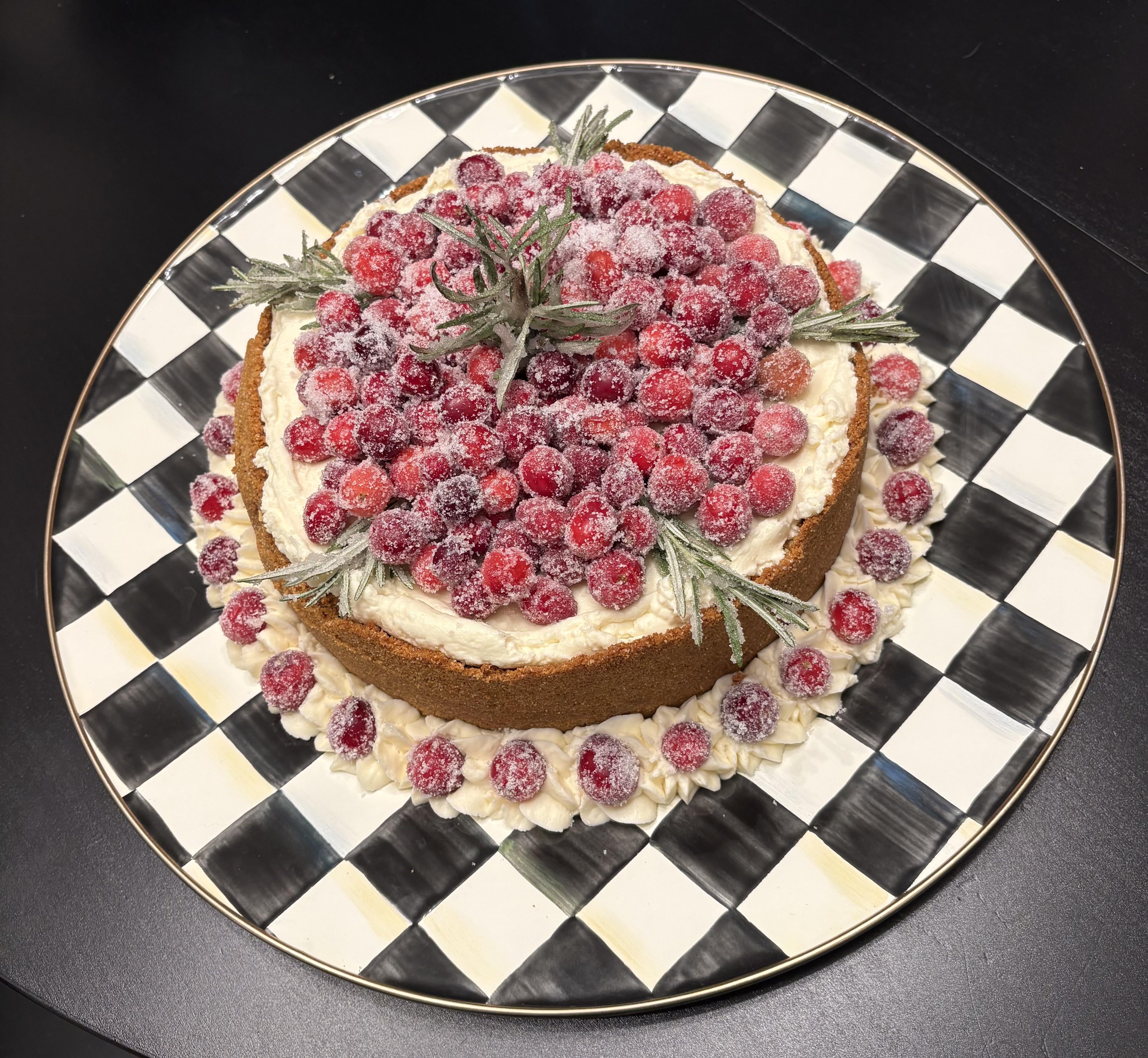 A vanilla bean cheesecake with cranberry swirl, ginger snap crust, white chocolate mousse, and jeweled cranberries. I used portions of four different cheesecake recipes, which is why I didnβt include a single recipe in this post. Now, weβll see how it tastes! Happy Thanksgiving, everyone! π