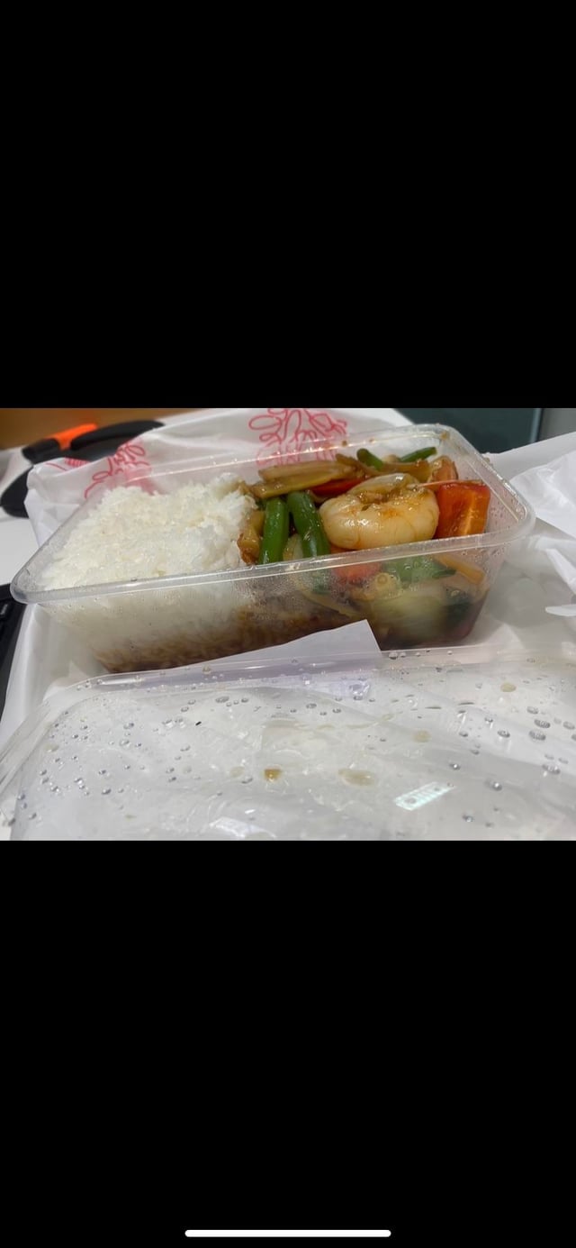 Served with rice. Internet says ka pow sauce has fish sauce, oyster sauce, light soy sauce, dark soy sauce, and sugar. Has 4 prawns. Note side view for size reference and sauce volume. This was delectable.