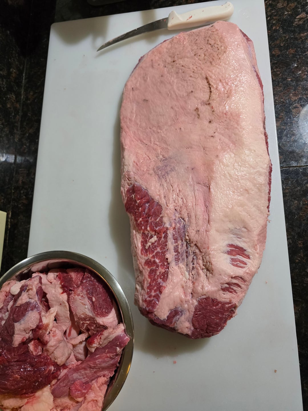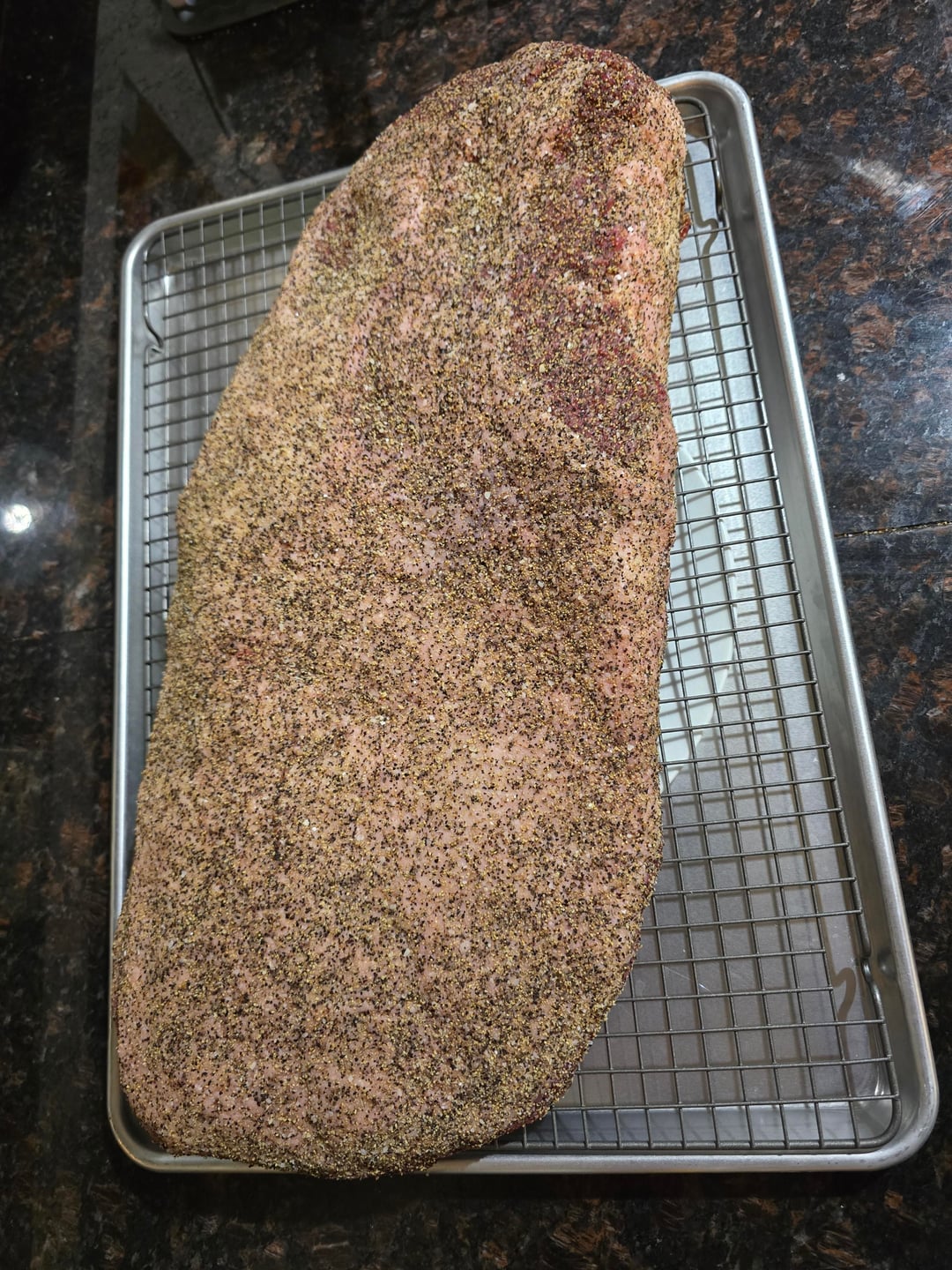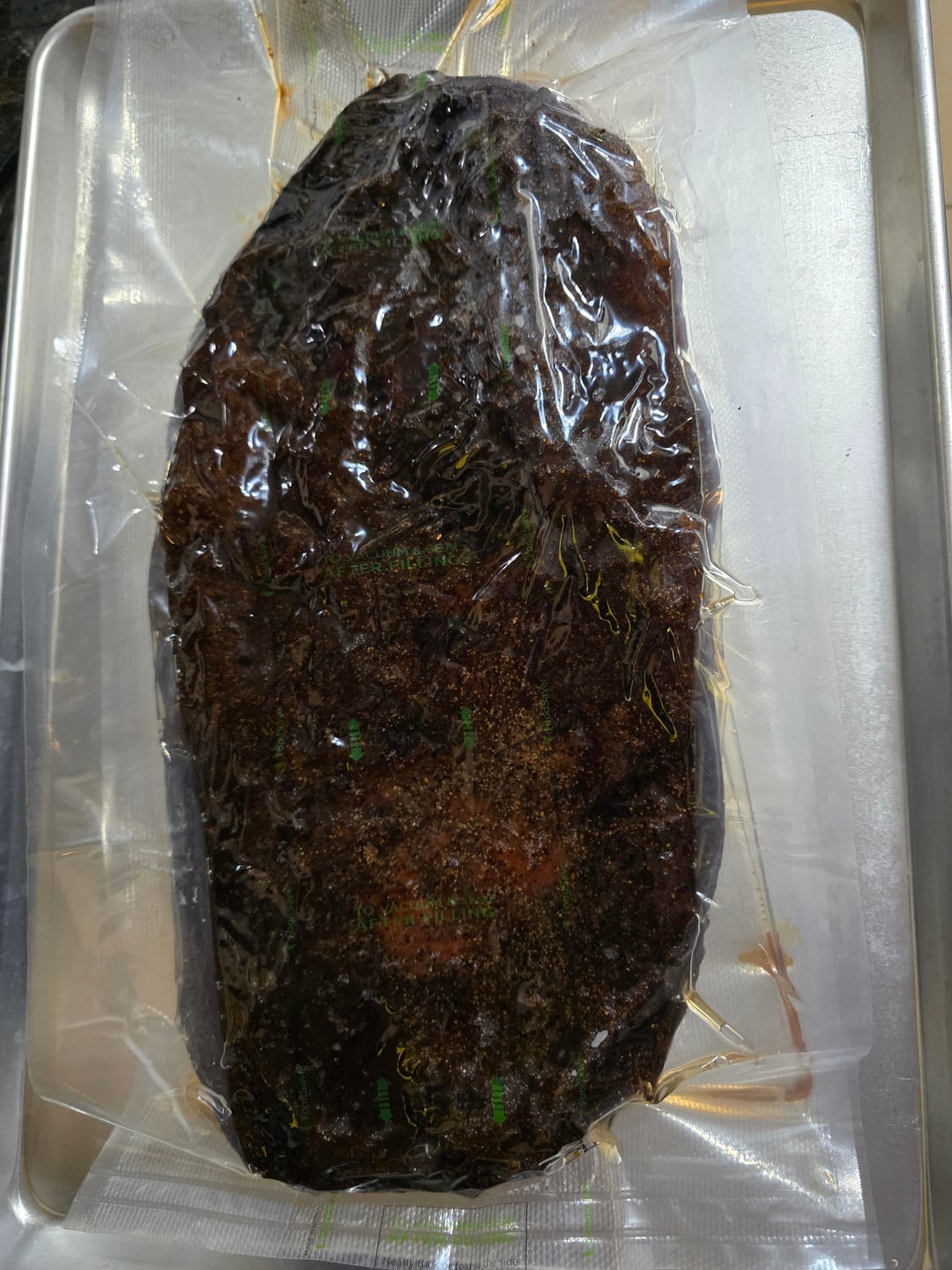 18.5 lbs trimmed down to 13.5 lbs. 16 hour smoke. 14 hour sous vide hold at 150° F.