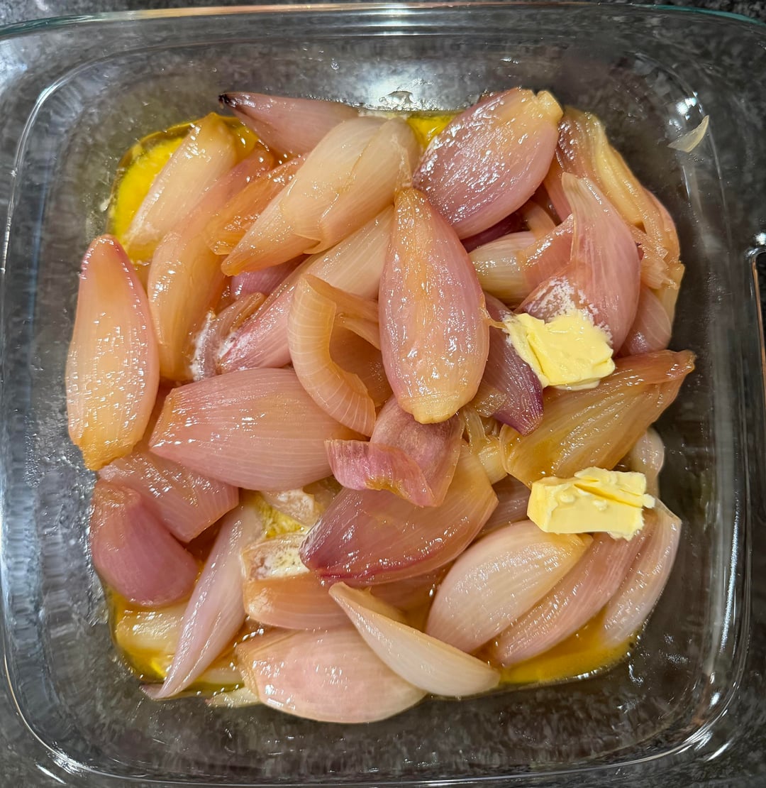 An annual Thanksgiving tradition. Glazed shallots offer a nice contrast to rich, carb heavy dishes. A before/after of 4lbs of shallots