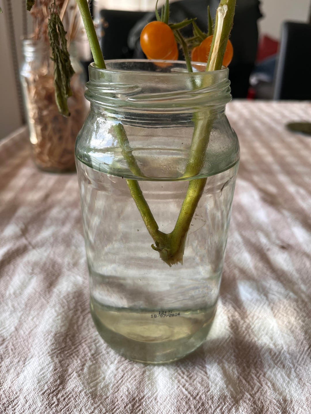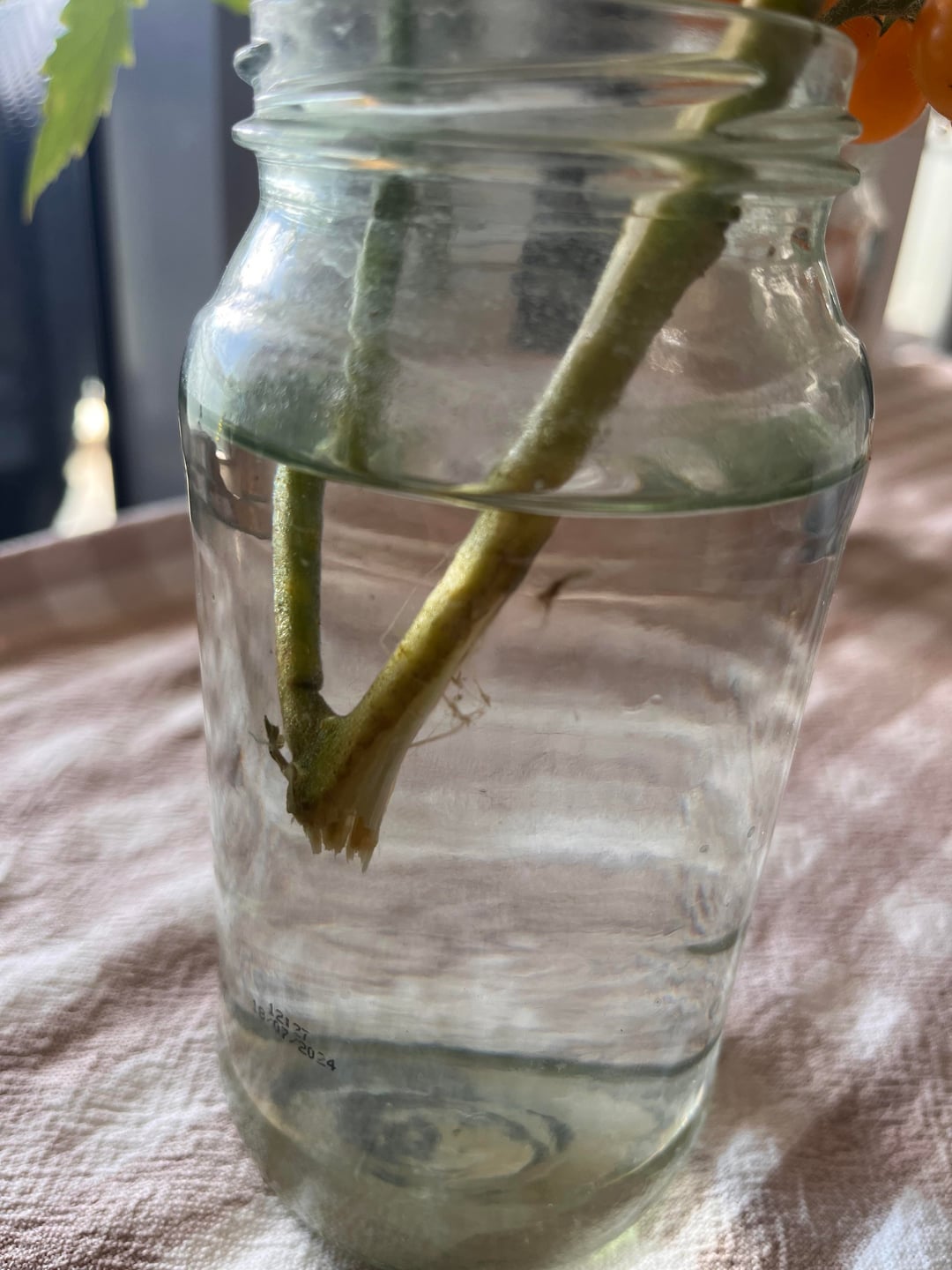 When I have done this I get really stressed, disappointed, and right up to the very edge of throwing it out because it droops down, gets wilted and looks dead. I let it go a few more days, and the next thing you know there are roots and leaves are perking back up! I get it in some moist soil start easing it back into direct sunlight, and boom! New tomato plant! I say all this so that you know it will go through all those stages, but it may snap out of it and come back to life at the end!