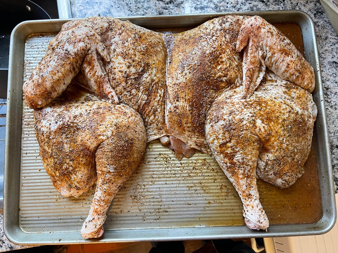 I’ve never spatchcocked a turkey on my Traeger before so after watching a Matt Pittman video, he suggested removing the breast bone as part of the prep. So I asked the butcher to spatchcock the turkey and if he would, please, remove the breast bone. Very young guy, didn’t look very experienced.