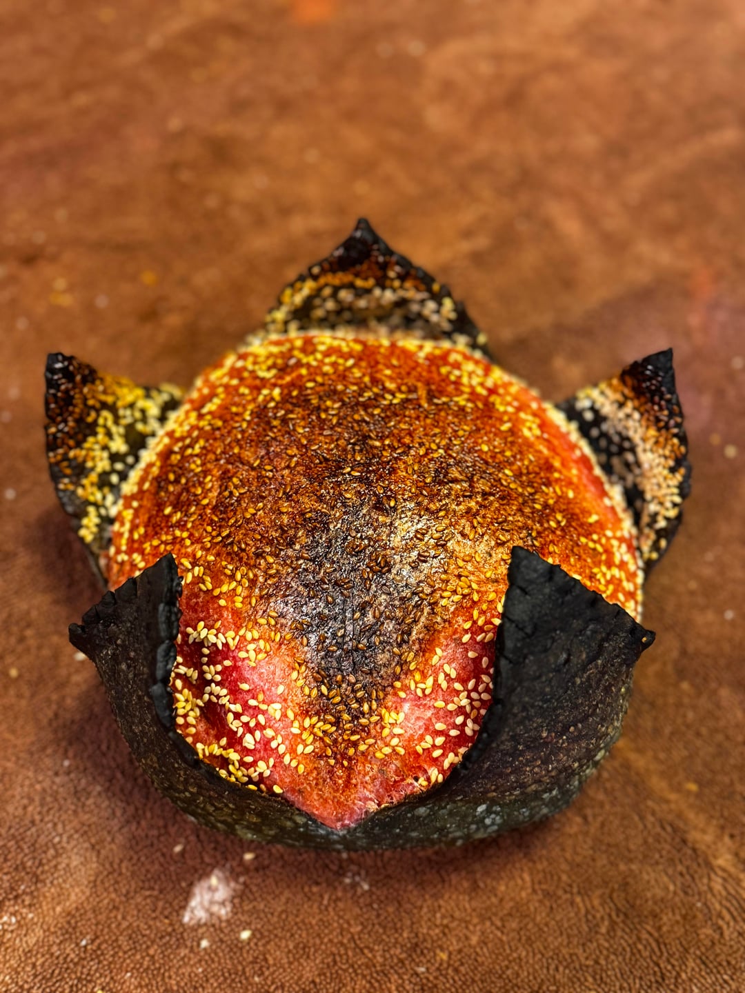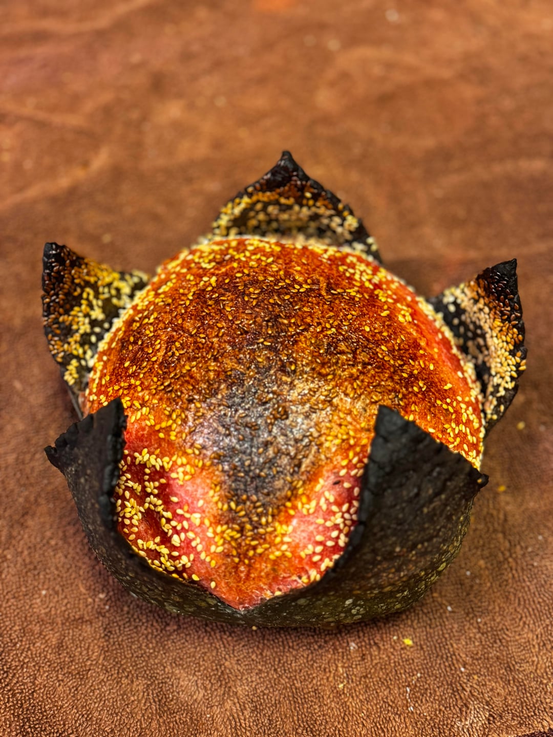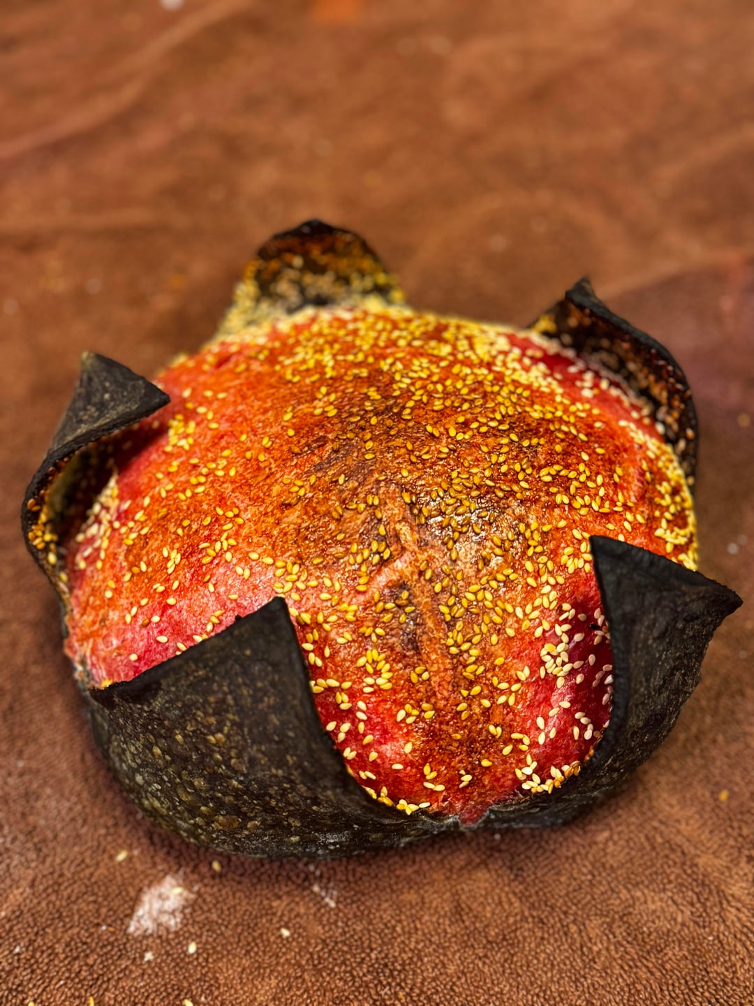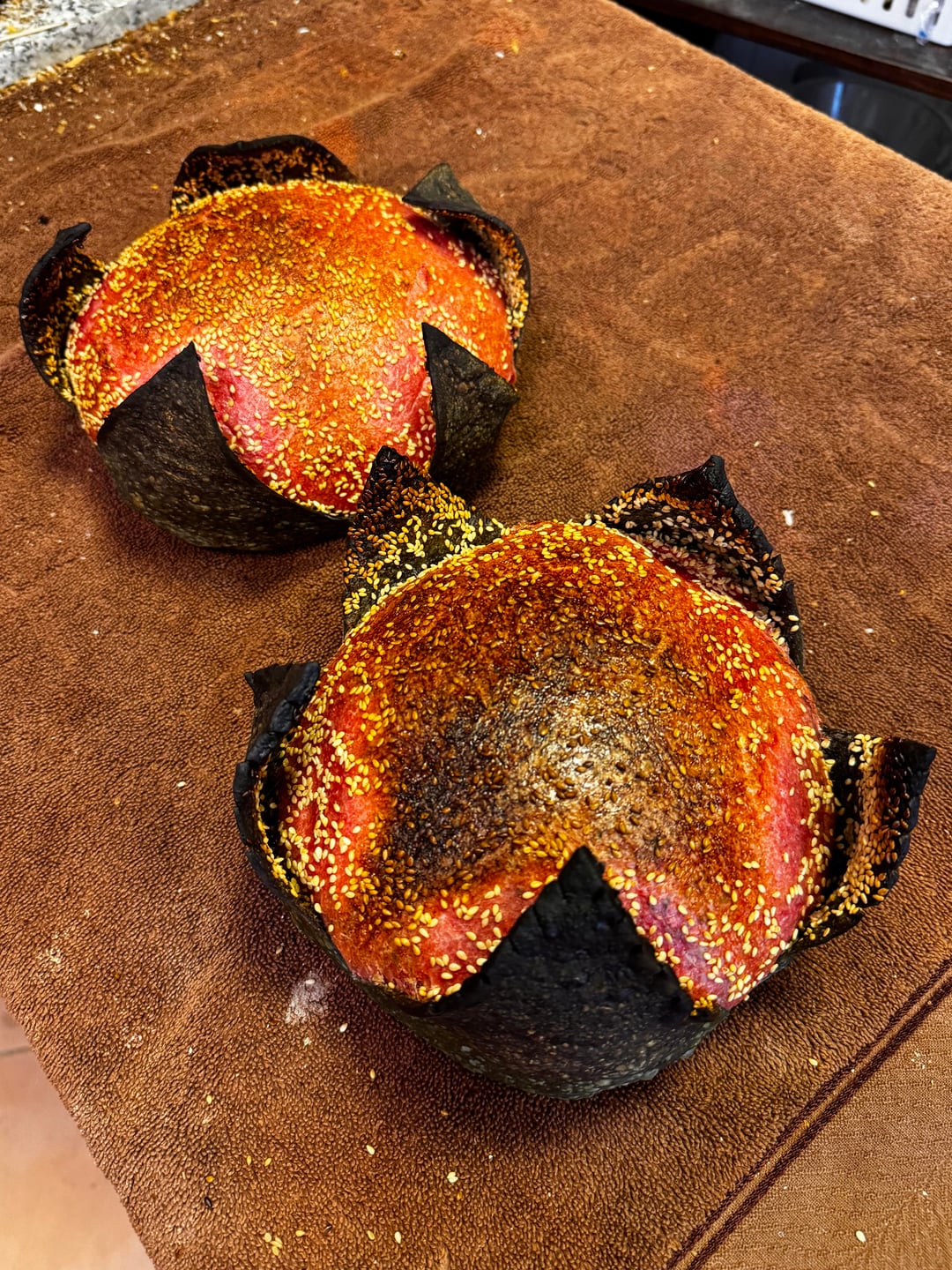 1’15 – shape red as boules, brush top with oil. Holding onto the seam side of the boules, roll the tops in sesame seeds. Place sesame of boule in the middle of the black dough – wrap and pinch black over all of red. Then flip the boules and round out (push & pull) on the counter. Place in bannetons & rest 30 minutes