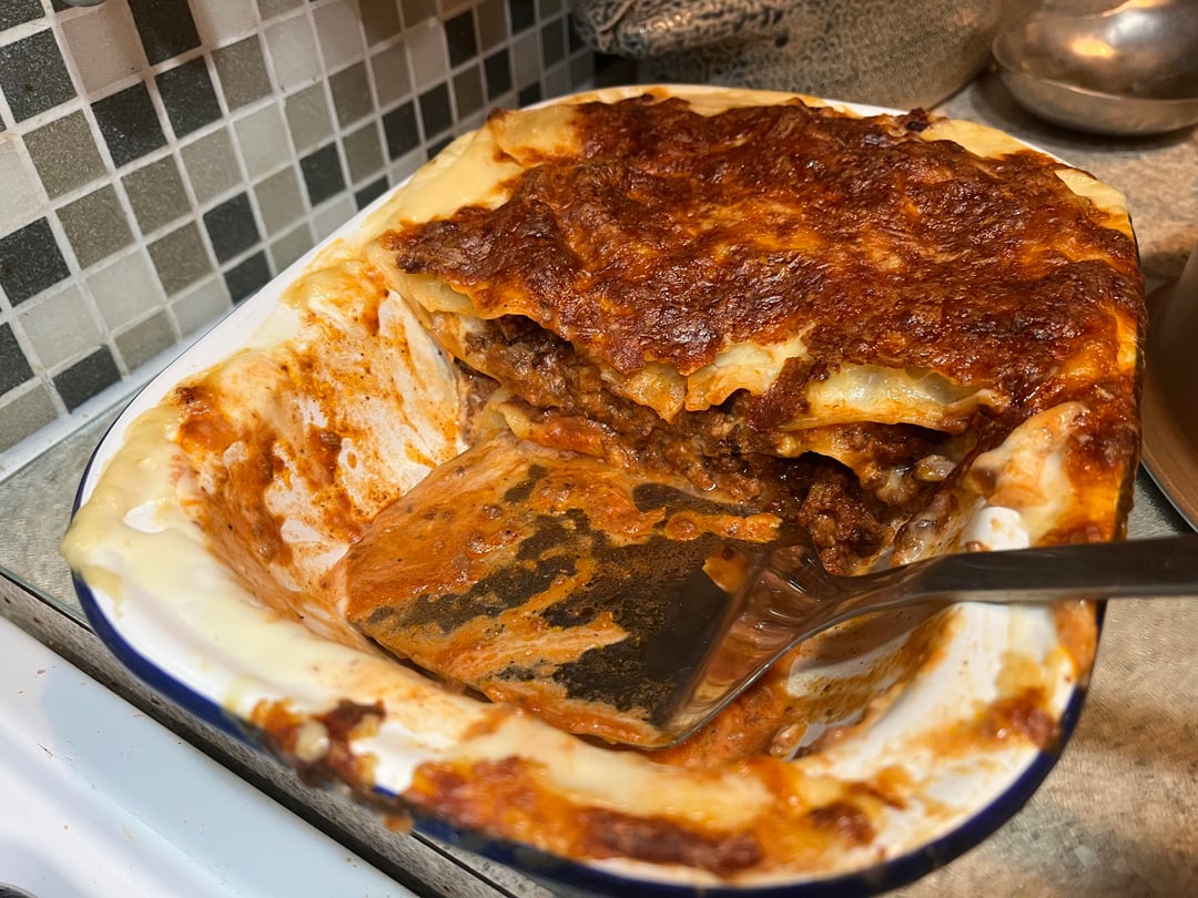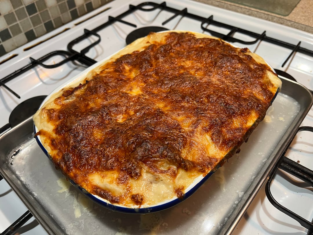 Made up of 750g mince, browned and then 200g beef stock, pizza sauce (pasatta infused with garlic and herbs), finely chopped mushrooms. Used a white sauce I had frozen previously and topped with mozzarella.