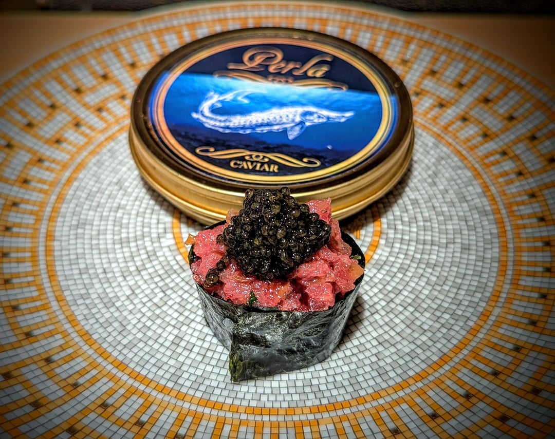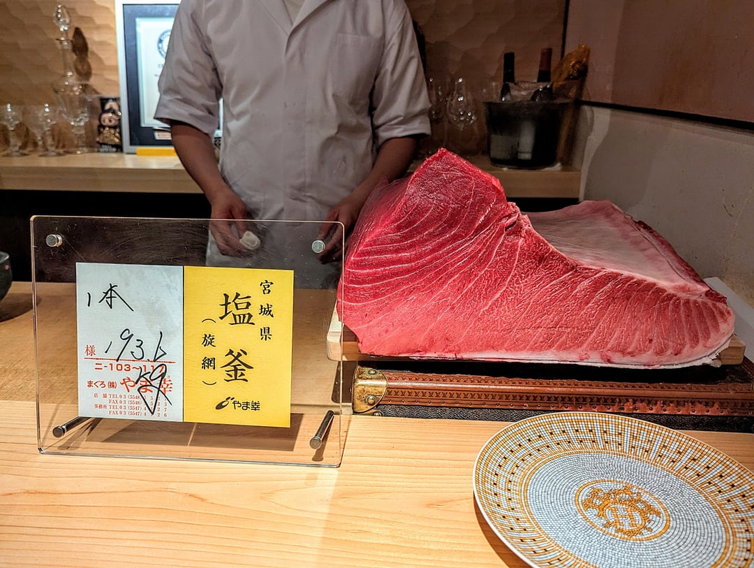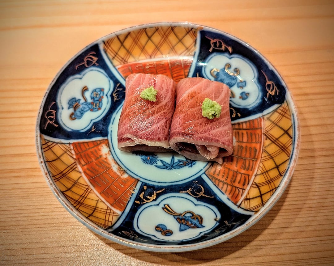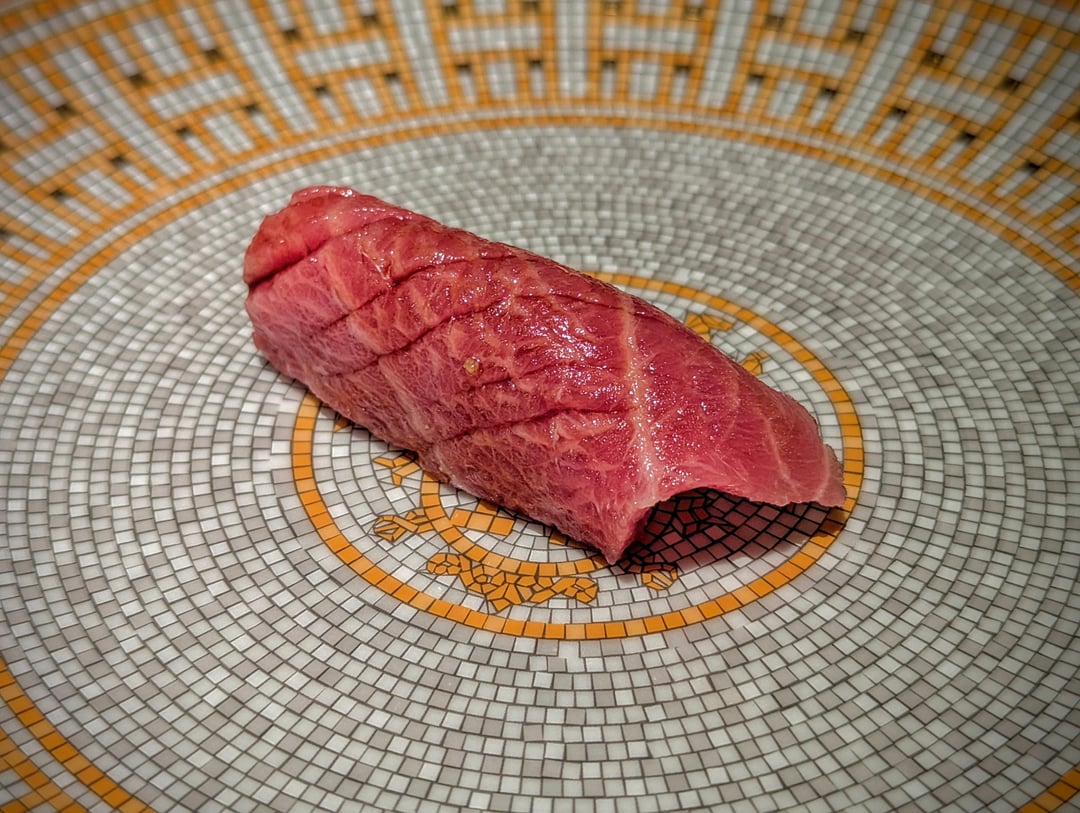 Skipping Sushi Takamitsu on this basis though would, at least in my opinion, be a grave mistake. I enjoy a more serene atmosphere while eating sushi, but listening to the occasional innane banter is a small price to pay for food this good. While the drinks suggested that Takamitsu-san may be the Tokyo King of Tequila, he has a greater claim to being the Tokyo King of Uni, a claim that was strengthened earlier this year when Takamitsu-san broke the record for the highest bid placed for uni in the country. Uni appeared six times throughout the meal in varying forms, from uni gunkan towards the end of the meal, to being partnered with fresh ikura that (quite literally) were bursting with flavour, via an uni cocktail adorned with a heap of white truffle. The uni on offer came from Hokkaido (Kita Murasaki and Bafun) and Kyushu (Aka), and although I visited in November and so there is no doubt less variety on offer than in peak season, I was still impressed by the depth of flavour and quality of the uni. In addition to the uni, it is clear that Takamitsu-san is also proud of the tuna cuts that he receives, these being procured from a vendor (Yamayuki) in Toyosu. The great slab of tuna belly that we are to feast from makes a procession of the LV plinths, for guests' picture-taking pleasure, before being transformed into a melt-in-the-mouth nigiri, where the shari is a blend of three different rice grains, and the vinegar is another blend of three: two red and one rice.