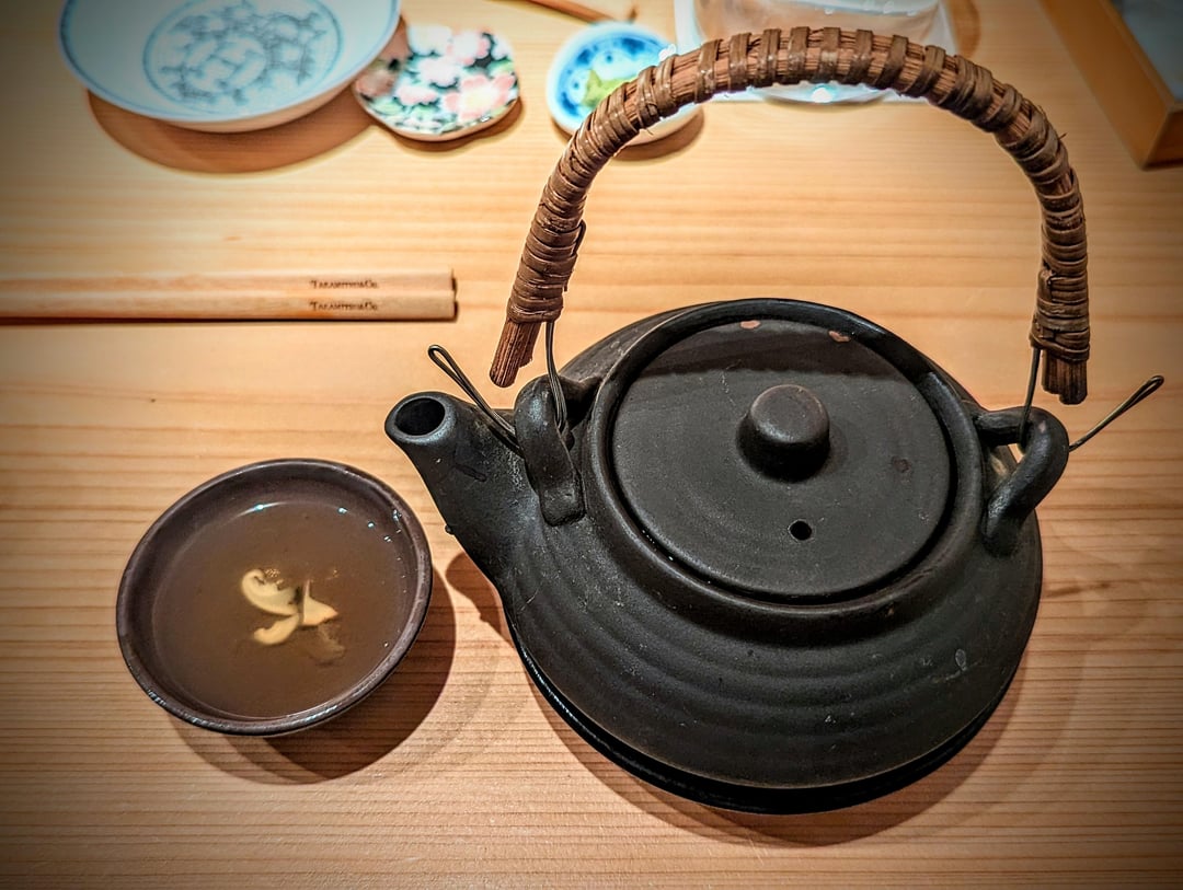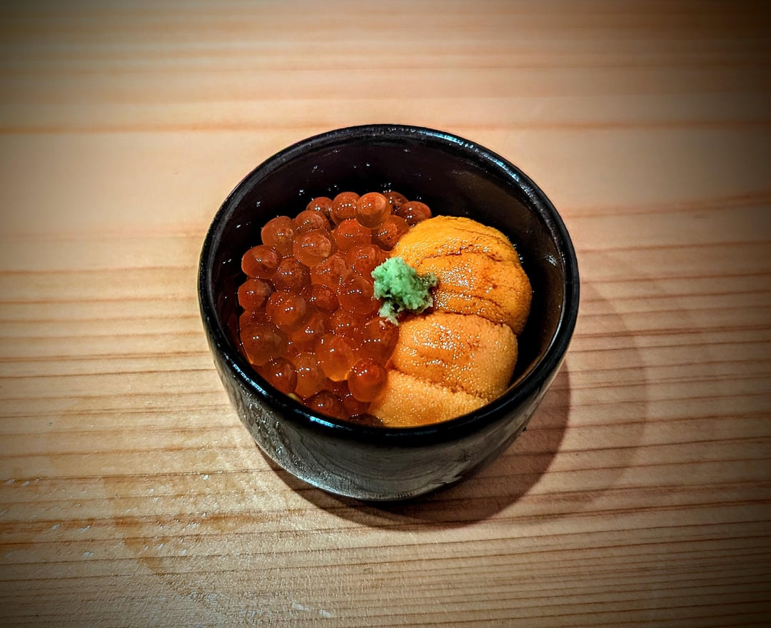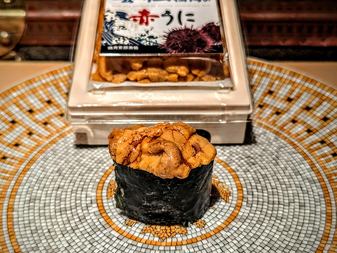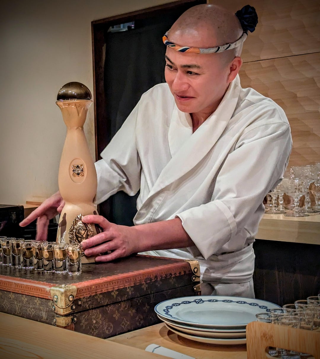 Next to the Meguro river in Nakameguro sits not just an outstanding sushiya, but a shrine to uni. Sushi Takamitsu, and by extension Takamitsu Yasuda, who started his sushi chef training at the age of 16 with Sushikou in southern Meguro, does not adhere to the typical attitude of quiet reverence; sushi as celebration, as a living thing, is in evidence here, with lively conversation encouraged. For the dinner service I attended (on my birthday, no less, but I didn't mention this so received no preferential treatment) Takamitsu-san and his staff nurtured a convivial atmosphere throughout the meal. While the following descriptions are anecdotal, they serve to give a sense of what you might be stepping into when you book at Sushi Takamitsu: A fellow diner, as bald as Takamitsu-san, was jokingly referred to as chef, which Takamitsu-san picked up on and, at the end of the meal, temporarily proffered his headband and got the diner to pose behind the counter. Following this, shots of Yamazaki 18-year whiskey, Clase Azul Reposada Tequila, Clase Azul Limited Edition Día de Muertos 2025 (which was unopened, and a quick Google search after suggests it was around a $2k bottle), and Volcan De Mi Tierra X.A Tequila were lined up and given to each patron, gratis. Sure, this was one of the most expensive meals of my trip, being 67,500 JPY through Tableall, but – given the Tableall markup – it still is within the range of expectation just for the menu. To have these drinks given freely on top was unexpected, and very welcome.
